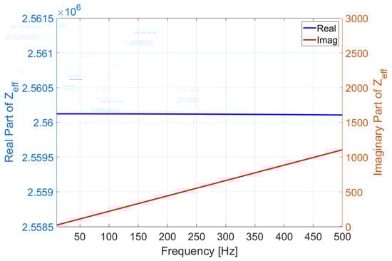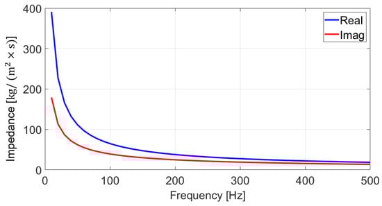 The calculation results are presented in Figure 10, where the blue and red lines represent the real and imaginary components of the complex impedance, respectively, with units of . The left and right axes correspond to the real and imaginary components of the complex impedance, respectively. For comparison, the scales of both axes are fixed. The impedance calculations reveal that up to 500 Hz, the difference in the real component of the acoustic impedance is on the order of , indicating a negligible level of reduction. Although the imaginary component increases with frequency, its magnitude remains at approximately 0.04% of the total impedance within the target frequency range, suggesting minimal influence. Even though the imaginary component of the acoustic impedance is expected to have little effect on underwater sound radiation, both the real and imaginary components of the frequency-dependent acoustic impedance were extracted and applied to the seabed boundary in the numerical model to reflect the material properties accurately.