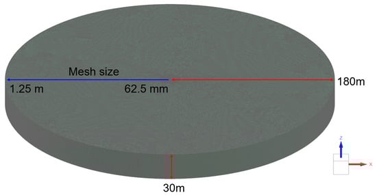 The constructed acoustic mesh is presented in Figure 13. To extract data from the acoustic mesh, a microphone mesh was created with a size of 400 m, encompassing the acoustic mesh, which had a radius of 180 m. To ensure sufficient sampling points for sound pressure extraction, the mesh size was set to 10 m. The combined configuration of the acoustic mesh and microphone mesh is illustrated in Figure 14.