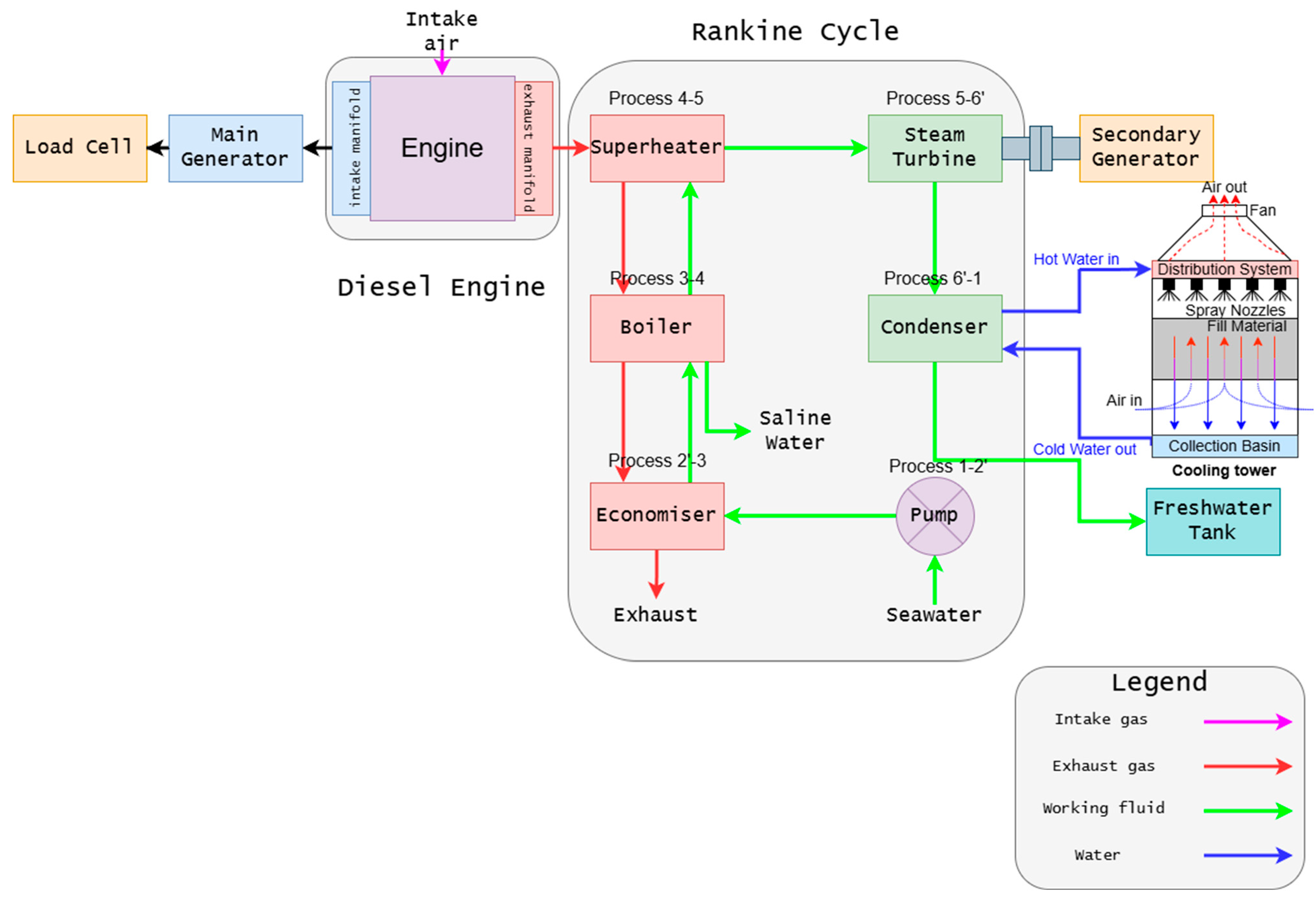 22] research has been conducted on a waste heat recovery system coupled with a low-capacity desalination system. The desalination setup comprises an integrated water-cooled condenser and a single-pass evaporator. Experiments were carried out on a 10 HP diesel engine under different loads. The results indicate the production of 4.2 L per hour of potable water with no discernible impact on the engine performance. According to Wang et al., in a ship diesel engine, only 40–50% of the fuel energy can be converted into mechanical energy, with the rest being lost as heat. This heat is dissipated through cooling water and exhaust gas. A waste heat utilization device designed for a marine diesel engine, which extracts heat from high-temperature exhaust gas, has successfully generated freshwater. The waste heat recovery system not only enhances the efficiency of a marine diesel engine but also lowers maintenance costs by providing additional protection to flanges and valves exposed to high-temperature steam [