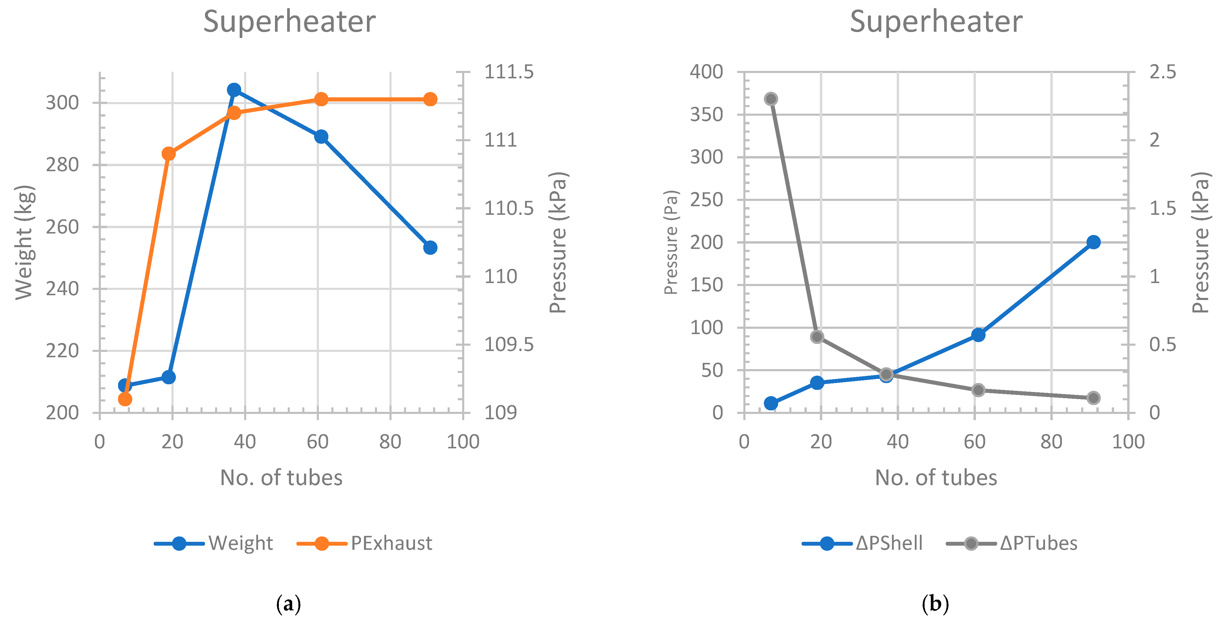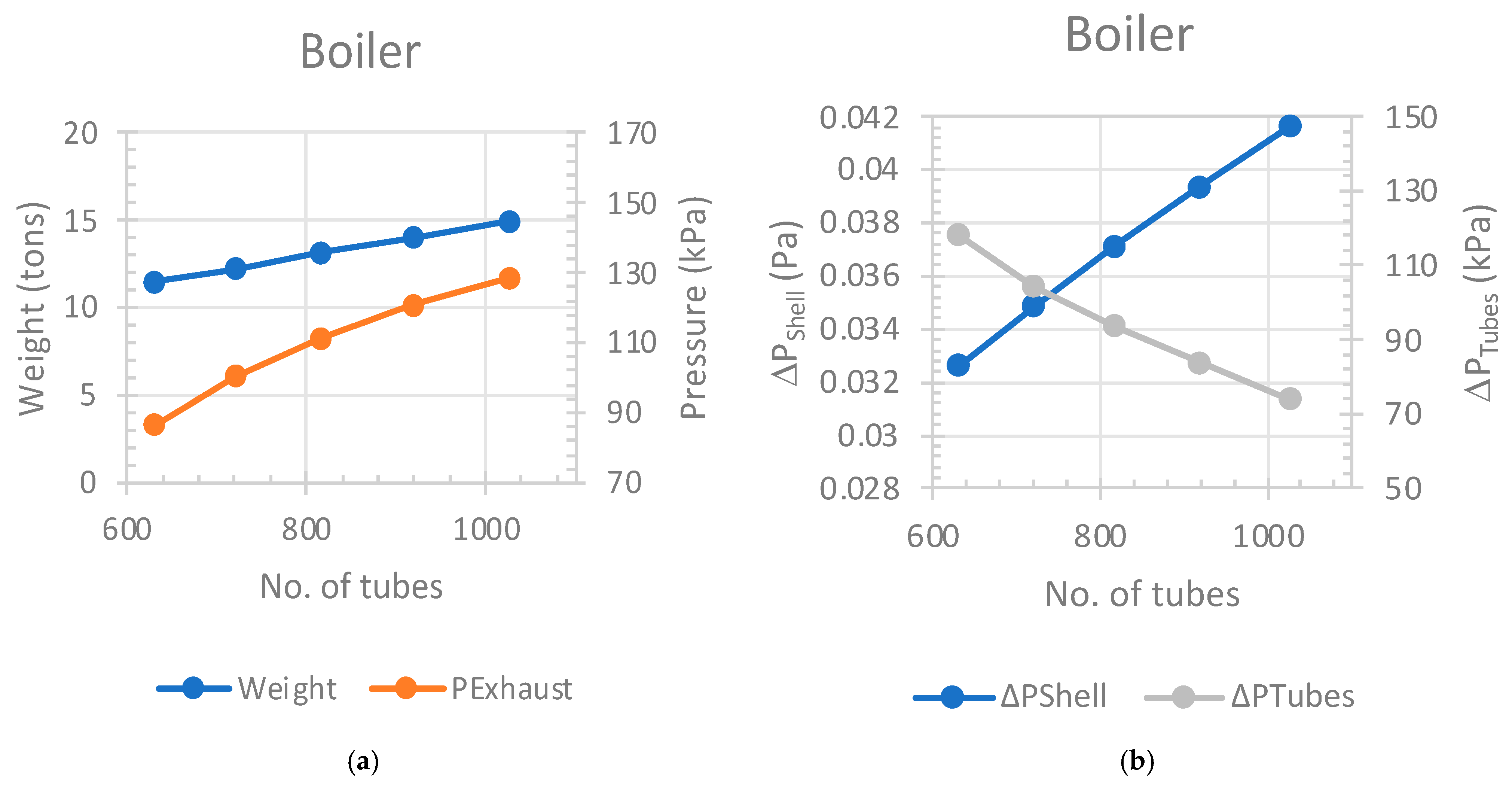 Figure 5a illustrates that an increase in the number of tubes corresponds to an increase in both the weight of the boiler and the exhaust pressure from the WHR system. Simultaneously, as illustrated in