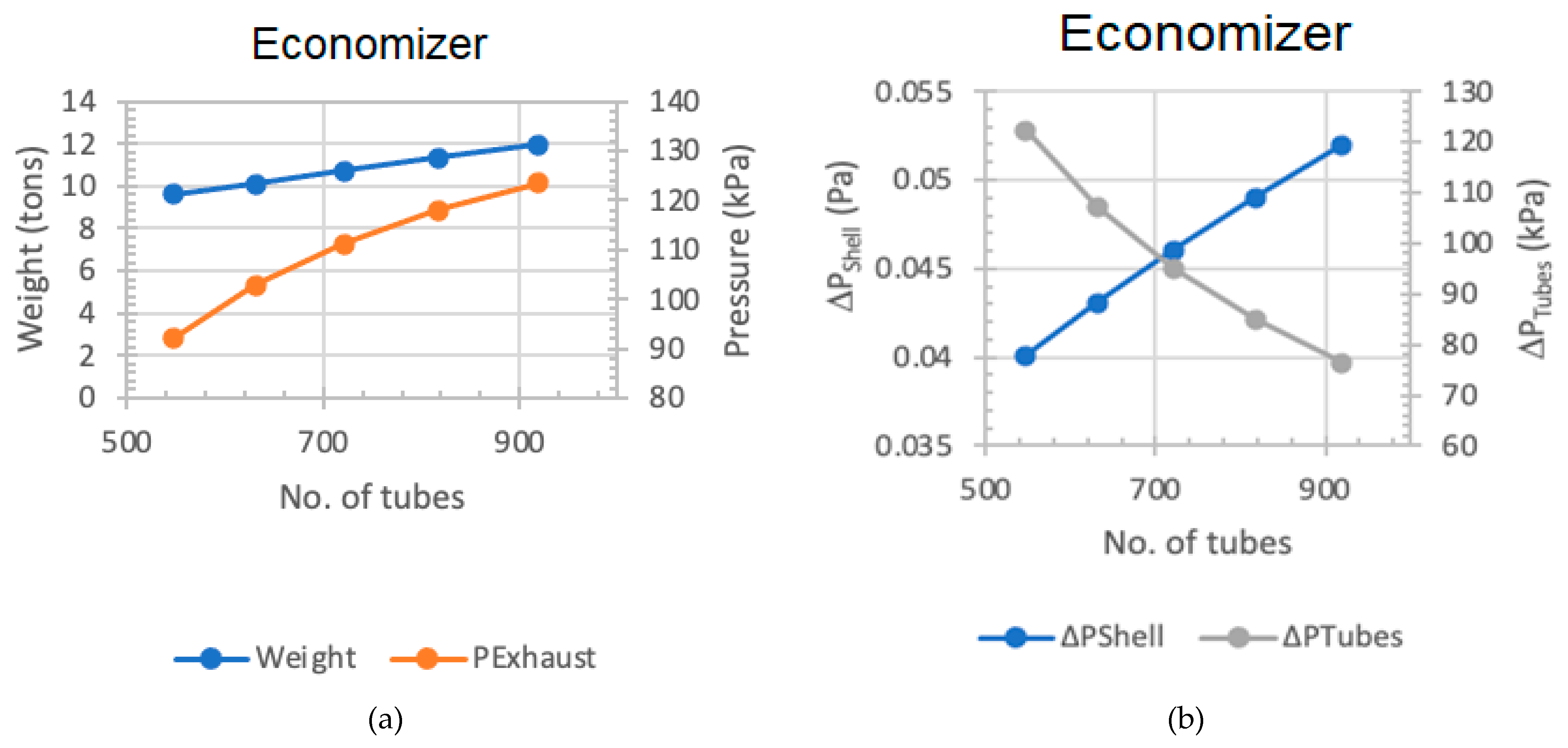 Figure 4a, increasing the number of tubes at 2 bar in the economizer leads to a simultaneous rise in both weight and exhaust pressure within the economizer.