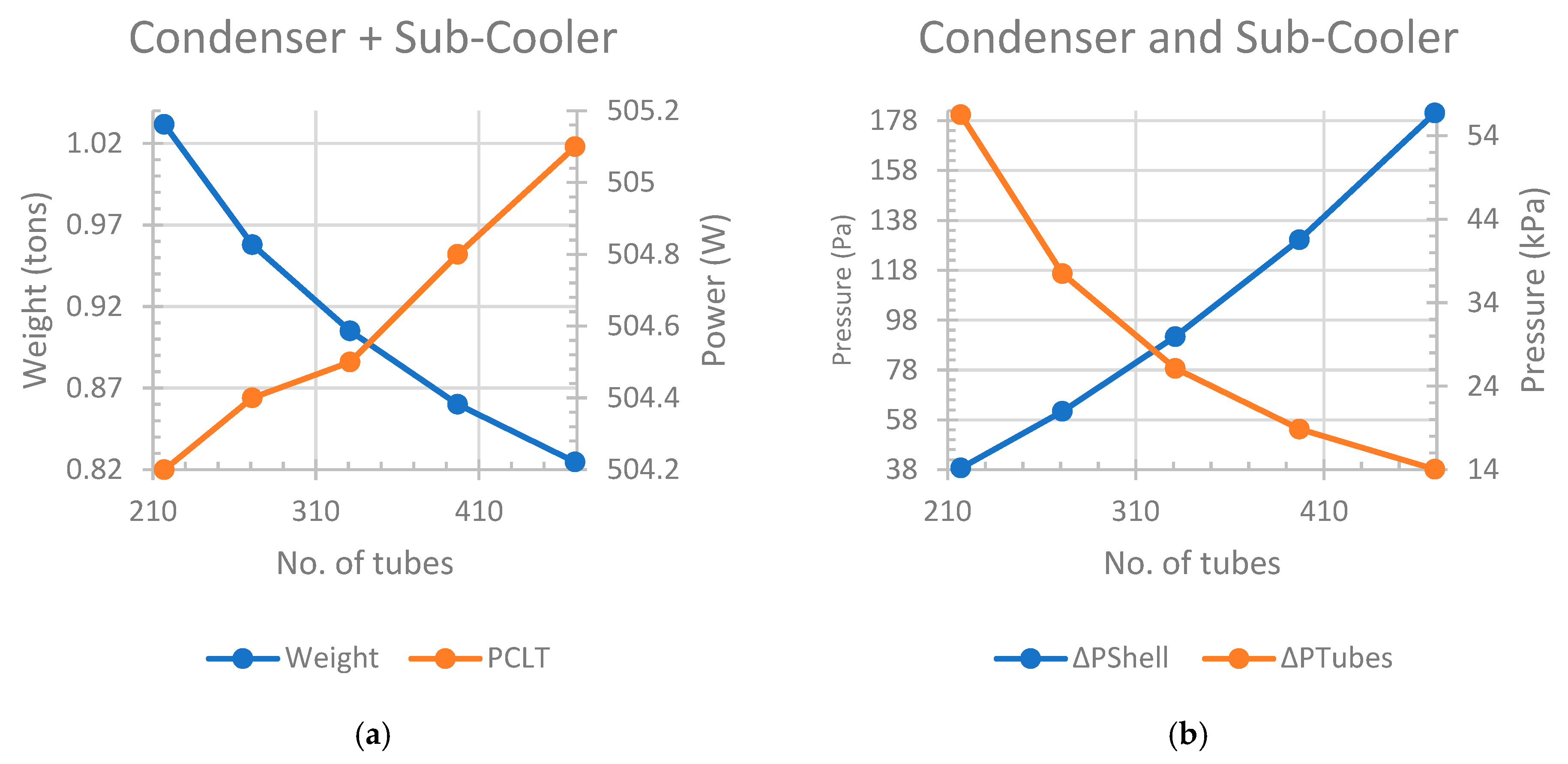 Figure 6 shows the trend between the number of tubes within the combined condenser and sub-cooler heat exchangers and the total weight. Analysis of the graph indicates a downward trend in overall weight as the number of tubes increases. Therefore, in terms of weight, adding additional tubes to the design decreases the overall weight and consequently reduces manufacturing costs as less material is required. However, an opposing trend is observed when analyzing the number of tubes versus the total power required for the cooling liquid. An increase in the number of tubes negatively impacts the overall system by increasing the power needed to pump the cooling liquid. For 217 tubes, the total power needed for the cooling liquid is 504.2 W. Increasing the number of tubes to 469 results in a power requirement of 505.1 W. Consequently, as the number of tubes increases, overall system efficiency decreases, and annual running costs increase.