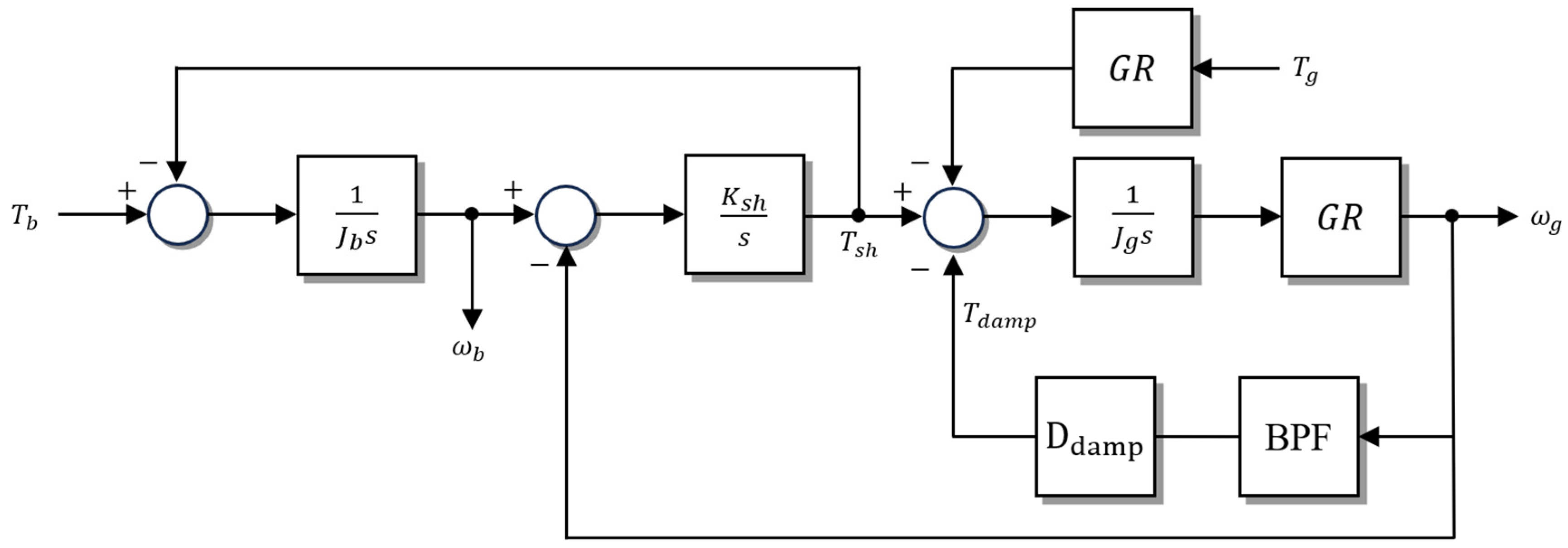 The core idea of the proposed approach is to directly compute the maximum shaft torsional angle corresponding to the input torque, given specific parameters and a damping coefficient. To this end, by incorporating the transfer function of the band-pass filter into the transfer function of the generator angular speed with respect to the generator torque defined in Equation (11),