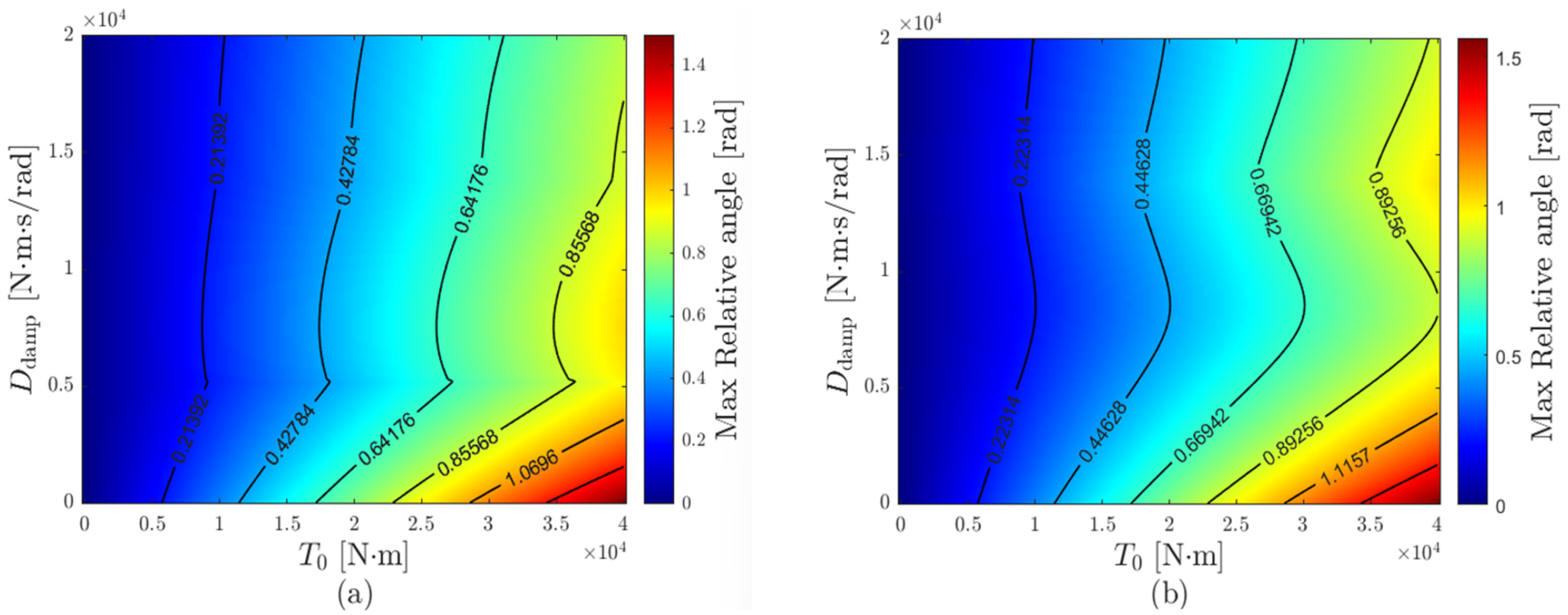 . An excessively large torsional angle increases the cyclic stress amplitude on the shaft surface, accelerating fatigue accumulation. Conversely, applying an overly large damping coefficient over-suppresses the transient response, resulting in prolonged speed recovery and degraded dynamic performance. Accordingly,