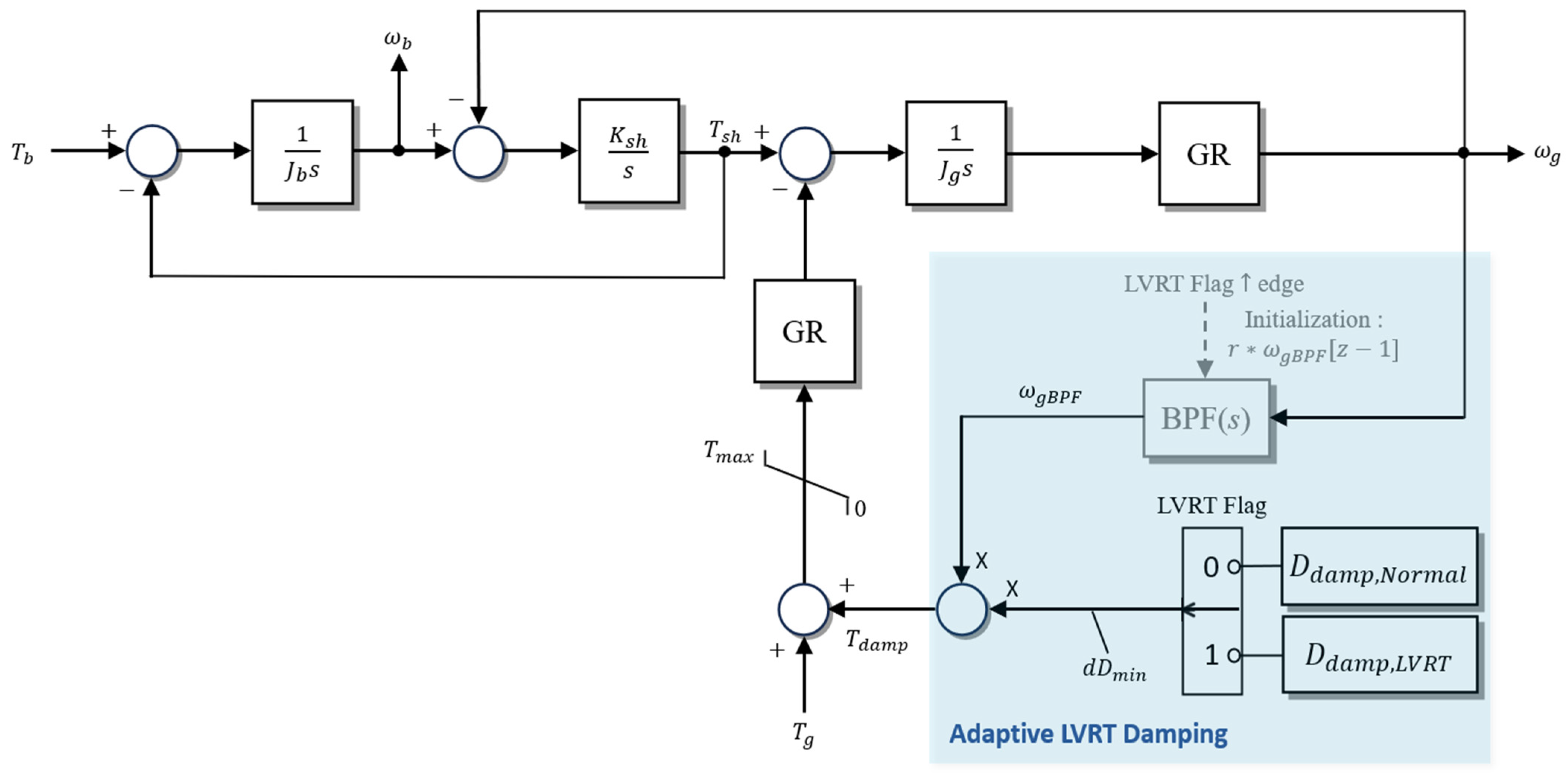 Therefore, under transient conditions such as LVRT, the damping coefficient must be redesigned by incorporating both the band-pass filter (BPF) characteristics and the effects of transmission zeros in the control path. To address this, the present study introduces a new damping coefficient determination approach that constrains the maximum torsional angle of the transient response based on the complete transfer function, including both the zeros and the BPF dynamics.