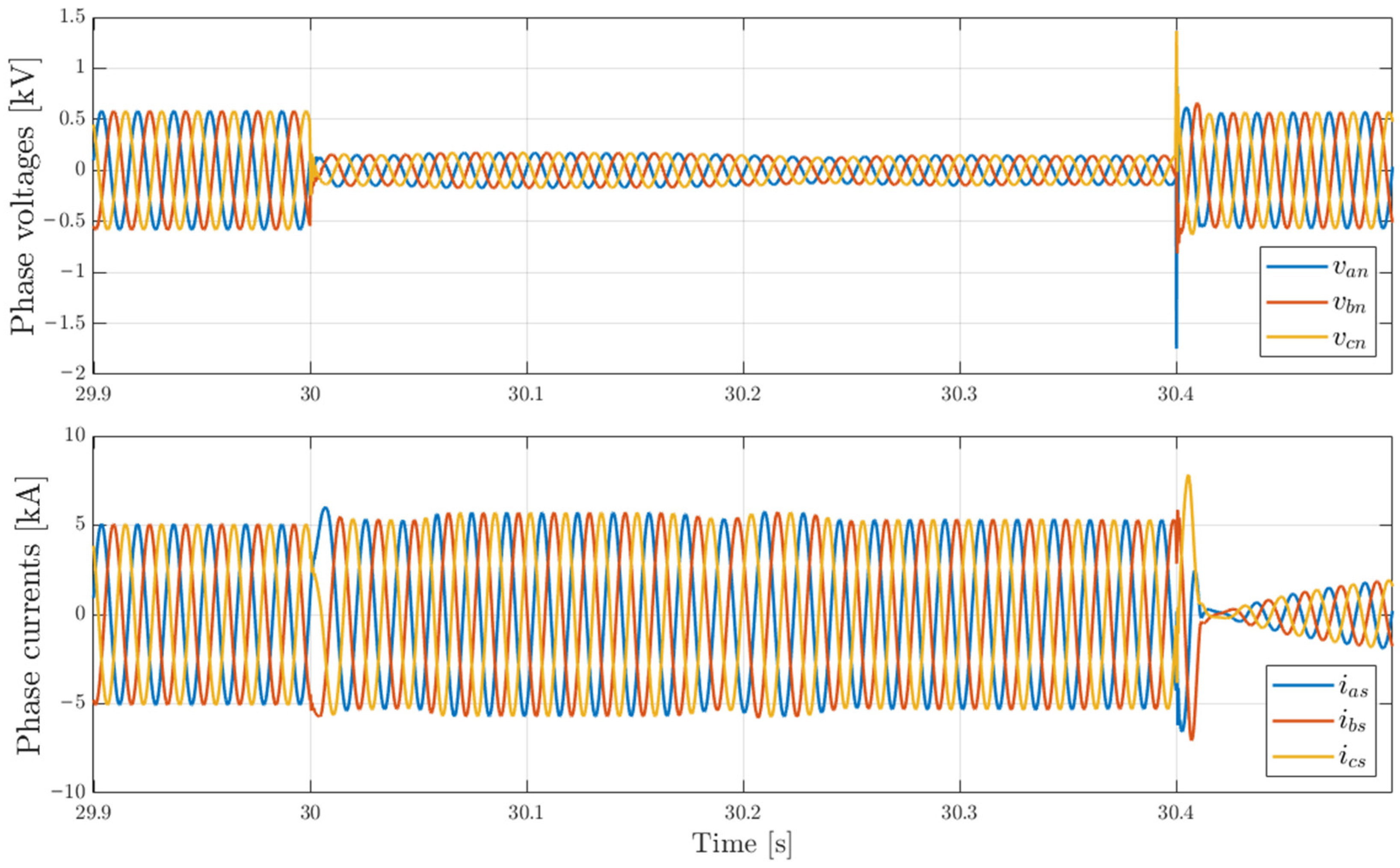 In addition, when the LVRT flag is activated, the transition between and is completed within a single control cycle (on the order of several hundred microseconds), thereby introducing no noticeable delay in the overall control response. Furthermore, since the operating frequency of the proposed algorithm is significantly lower than the sampling rate of the current control loop (several kHz), simulation results confirm that even a delay of 1–2 samples (approximately a few hundred microseconds) does not have a meaningful impact on the torsional damping performance. If the LVRT duration becomes excessively long, the turbine transitions to the shutdown sequence regardless of the damping torque effect. During partial voltage recovery, the damping torque compensation remains active as long as the LVRT flag is asserted and is deactivated only once the LVRT flag is released.