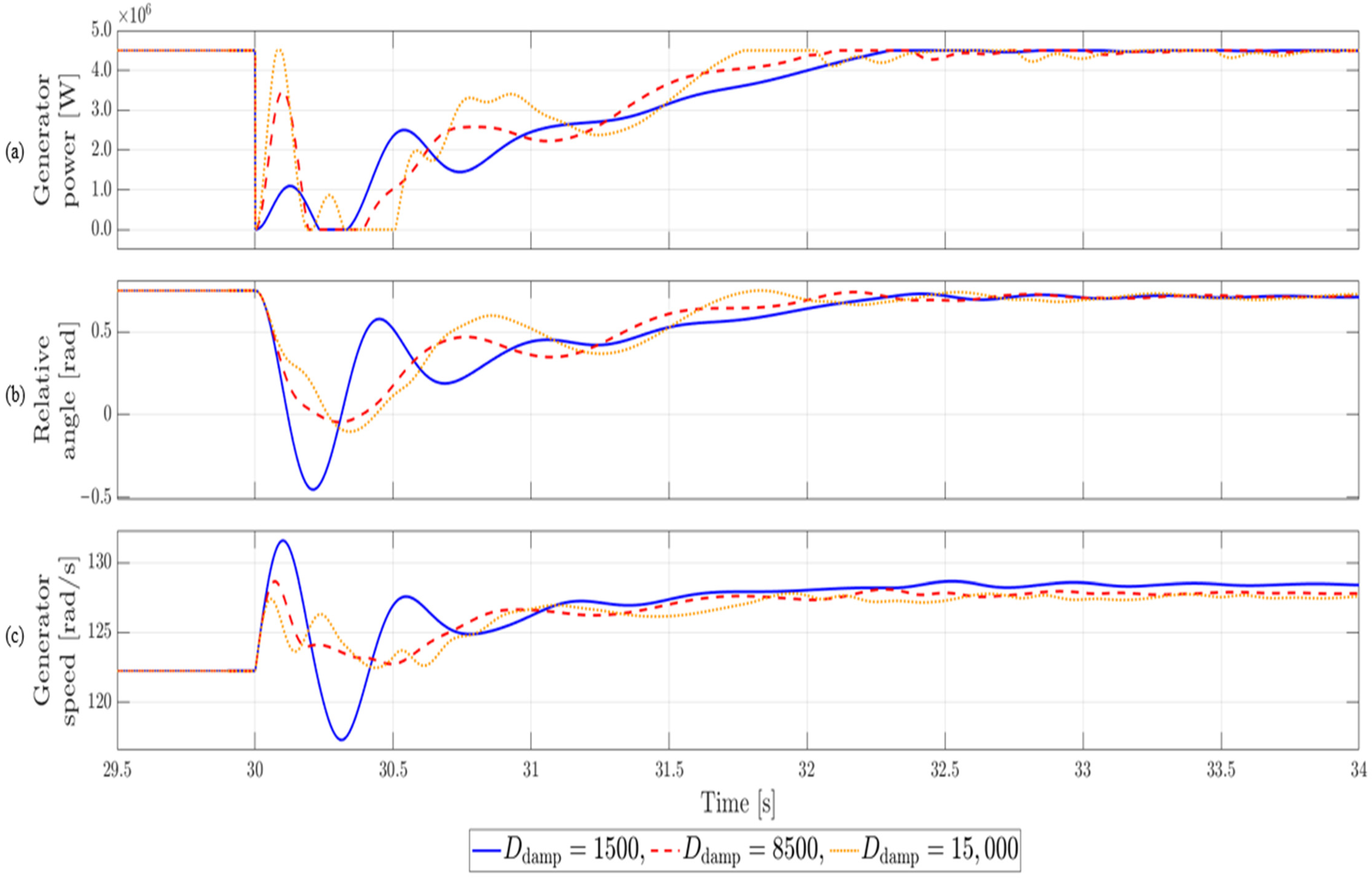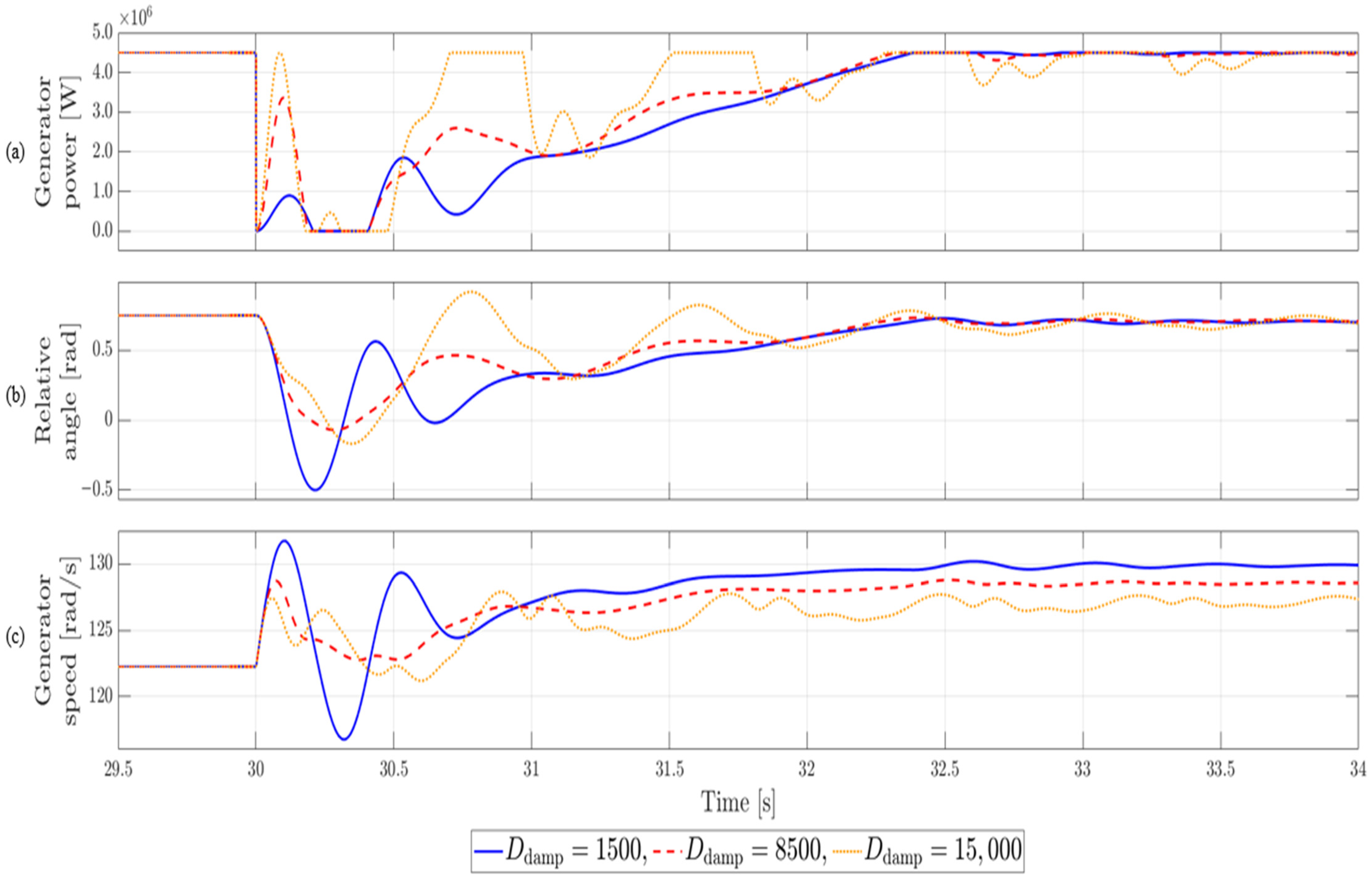 Figure 9, when the LVRT flag is activated, the damping coefficient transitions from its nominal value during normal operation (