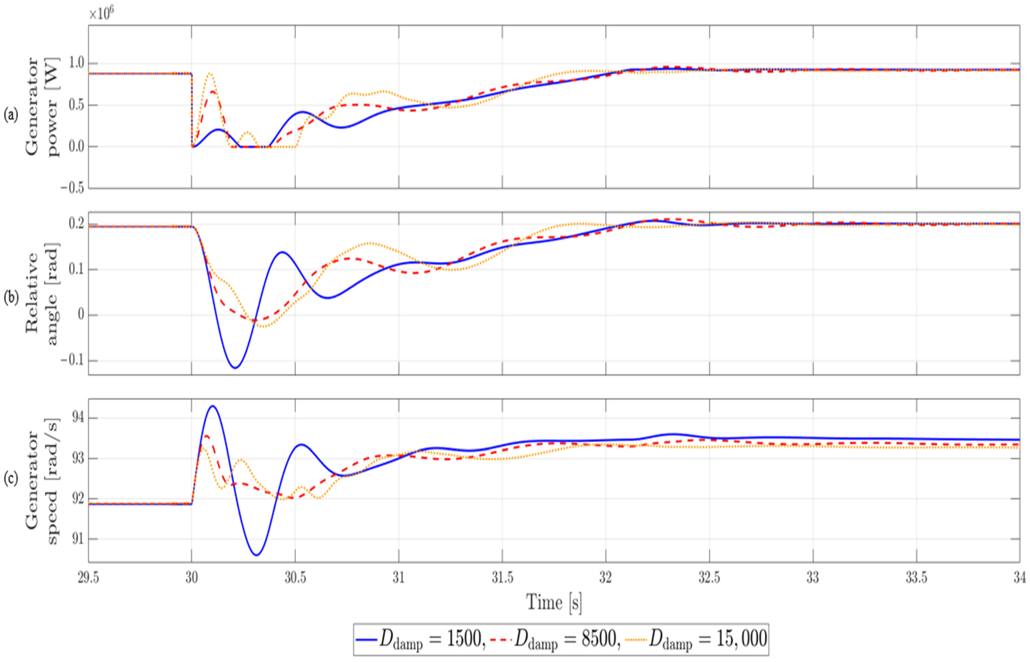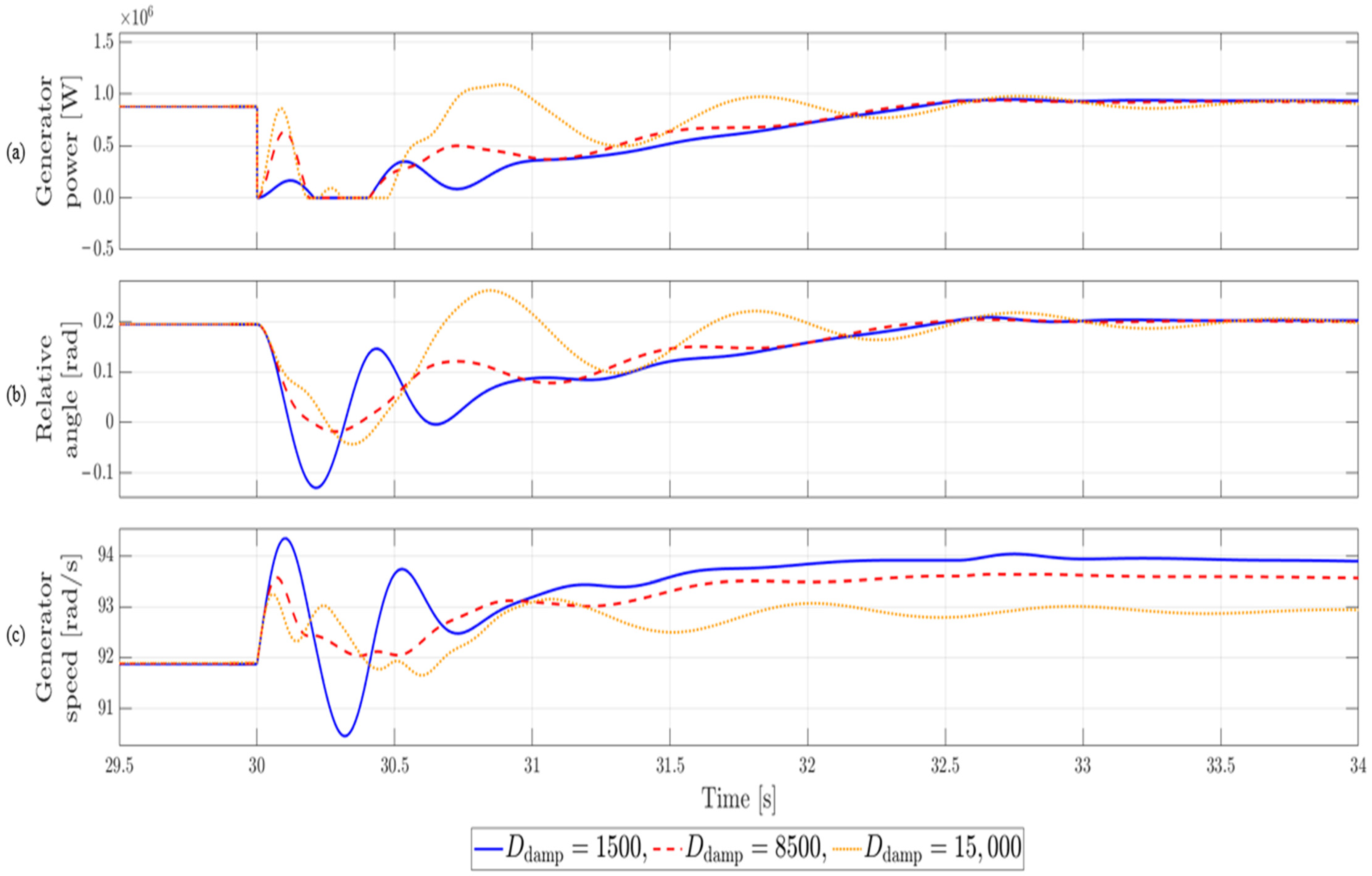 becomes zero, altering the system dynamics, and the generator speed response and maximum torsional relative angle also change.