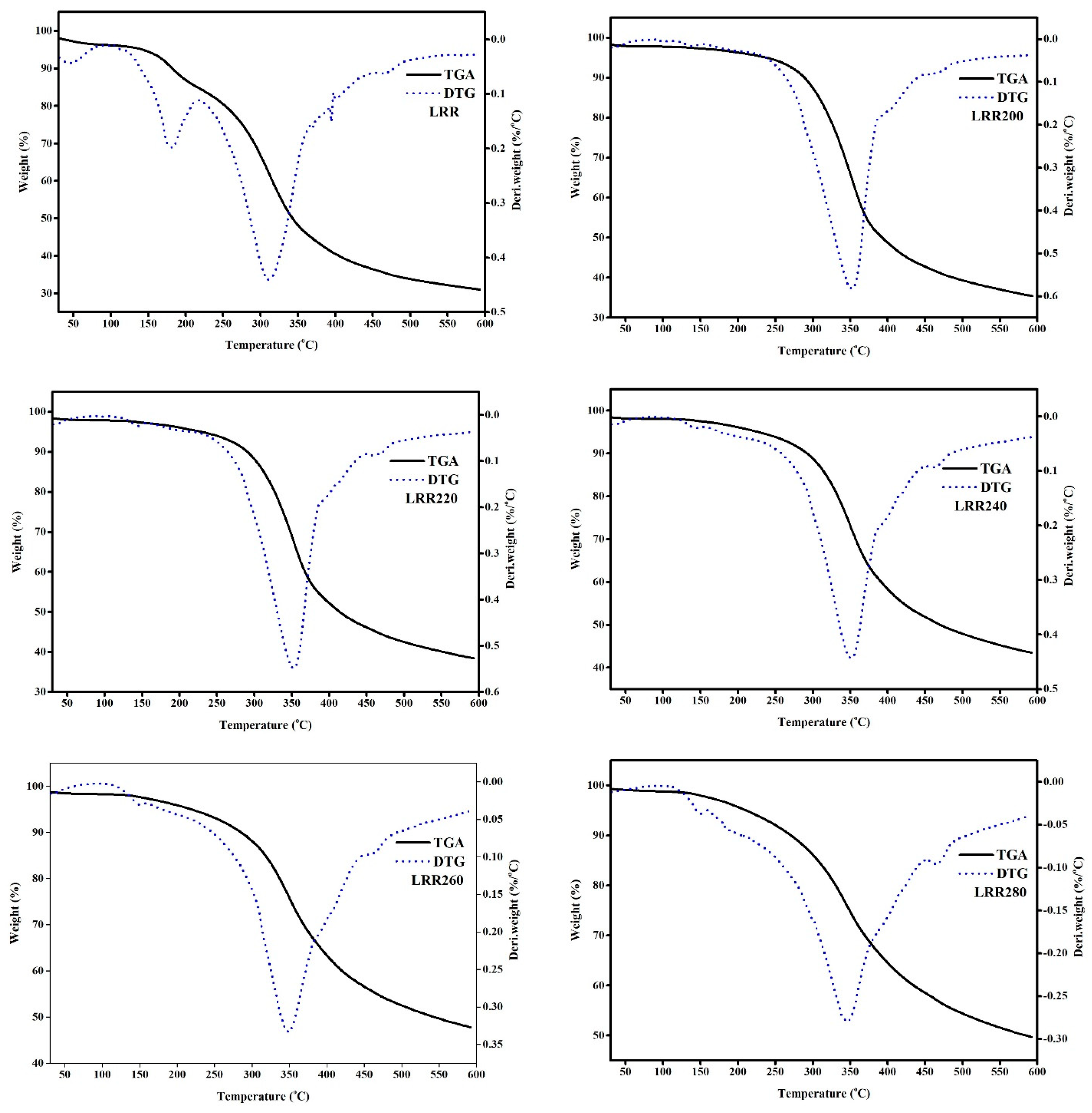 | Samples | Initial Temperature (Ti, °C) | Final Temperature (Tf, °C) | Weight Loss | DTG Peak Temperature (Tm, °C) | DTG, Rmax (%/°C) | Average Rate of Weight Loss (%/°C) | Residual Weight (%) |