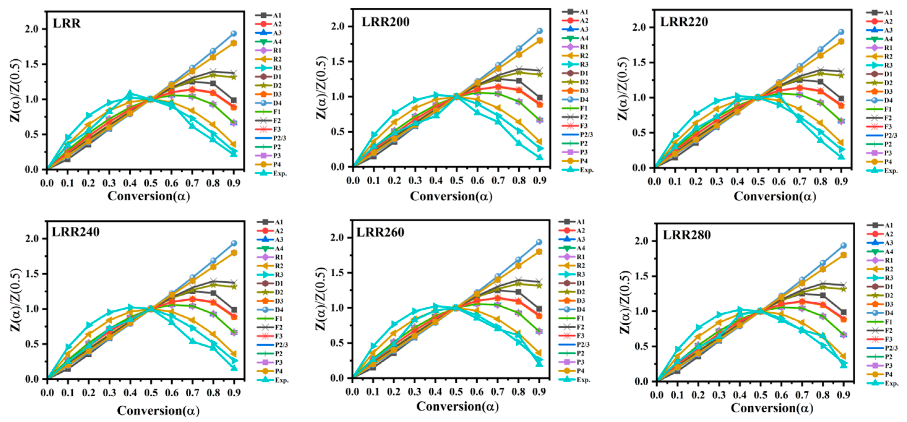 - Criado, J.M.; Málek, J.; Ortega, A. Applicability of the Master Plots in Kinetic Analysis of Non-Isothermal Data. Thermochim. Acta 1989, 147, 377–385. [Google Scholar] [CrossRef]