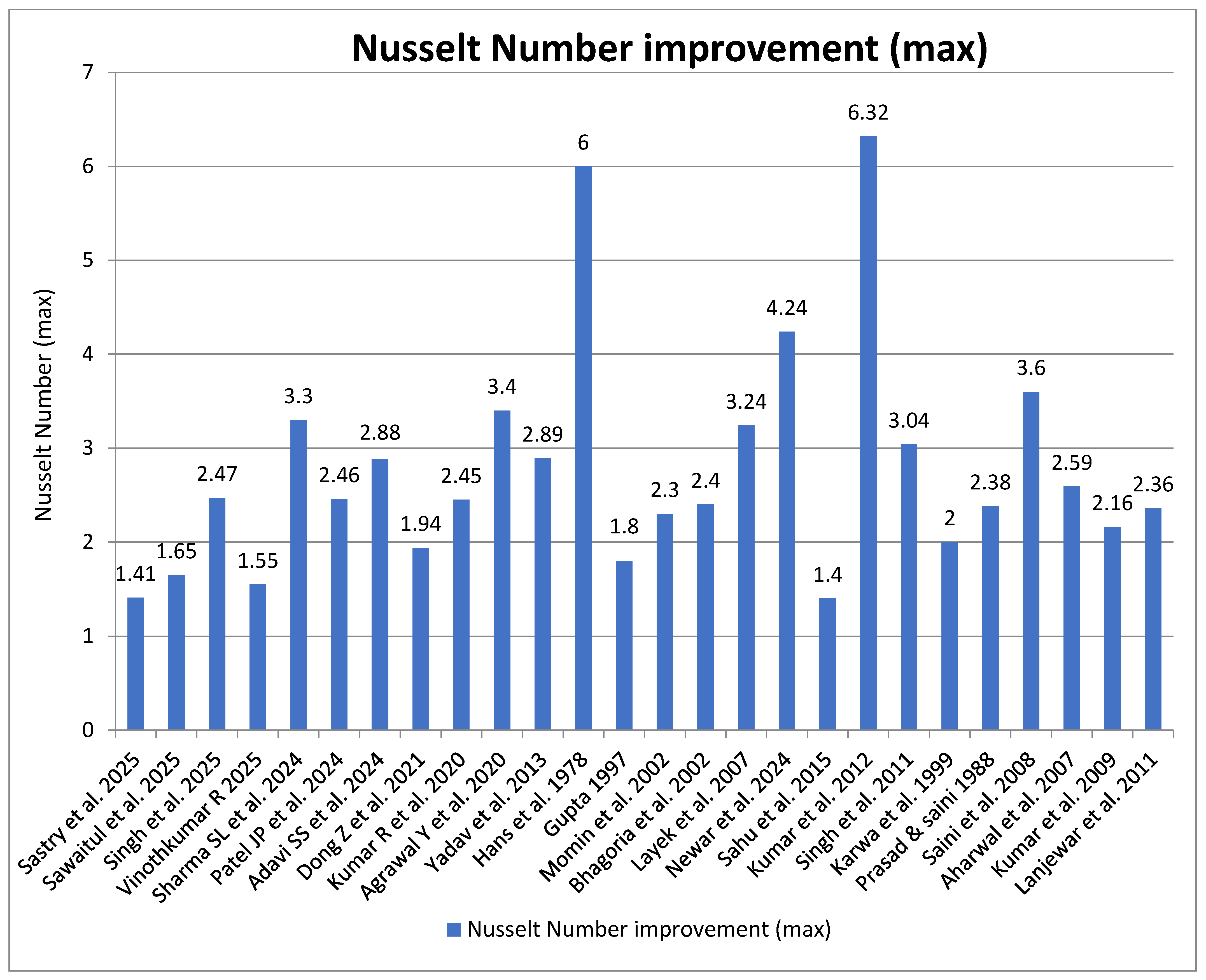 | 13 | Agrawal Y et al. [33] | Double Arc Reverse Shaped | P = 12 mm e = 1.2 mm e/Dh = 0.027 Re = 3000–11,000 | Max thermal efficiency of 60.23% at Nu = 30.93 and ṁ = 0.02015 kg/s. h increases by 28–34% with f rising from 1.5 to 2.7 times. |