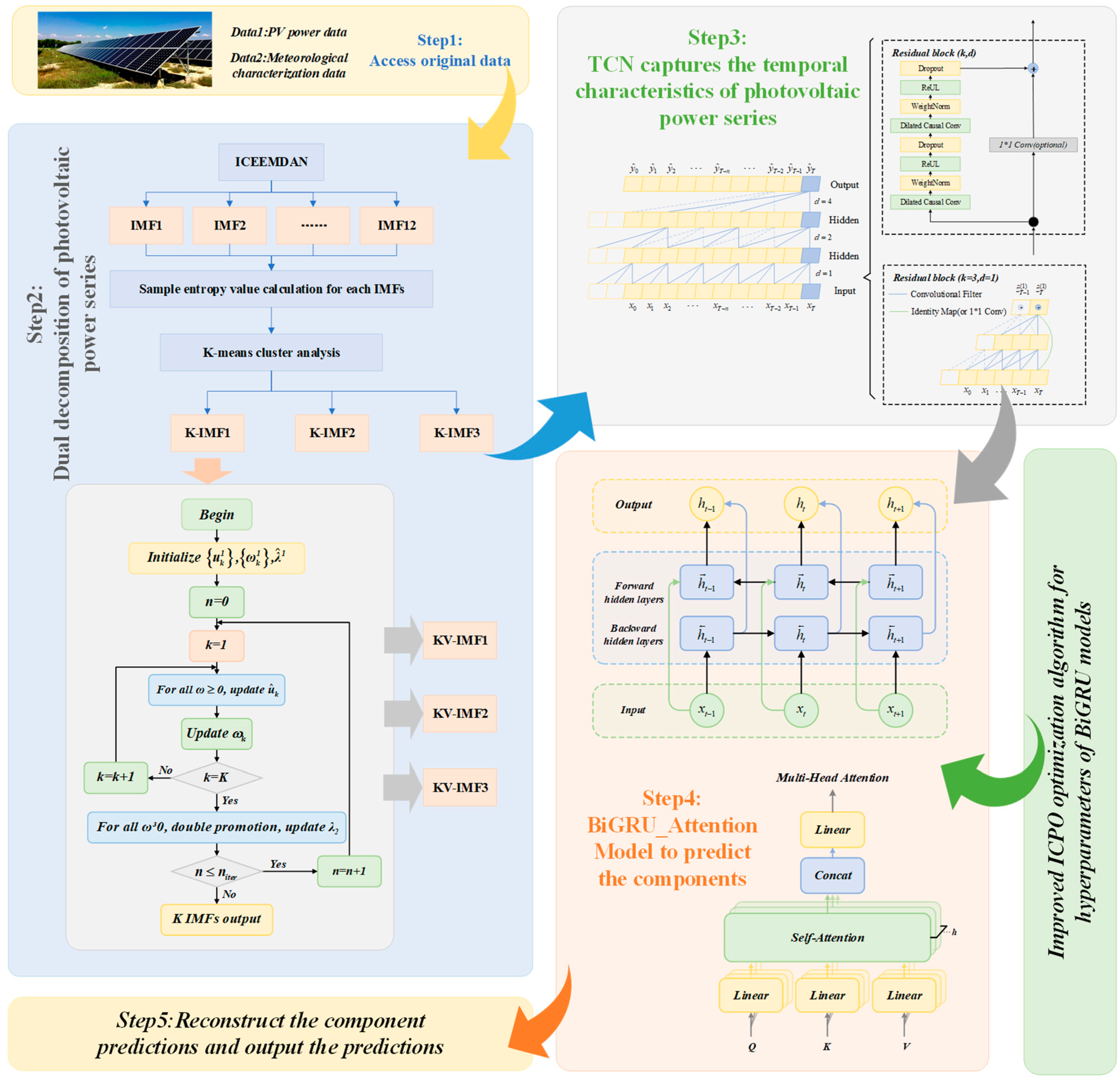 A novel hybrid forecasting methodology is introduced, integrating ICEEMDAN, VMD, TCN, BiGRU, Attention mechanism, and ICPO optimization. The TCN_BiGRU_Attention composite architecture demonstrates enhanced capability in capturing long-range temporal dependencies within power sequences while leveraging attention mechanisms to accentuate critical temporal features, thereby effectively modeling complex nonlinear relationships inherent in PV power data.