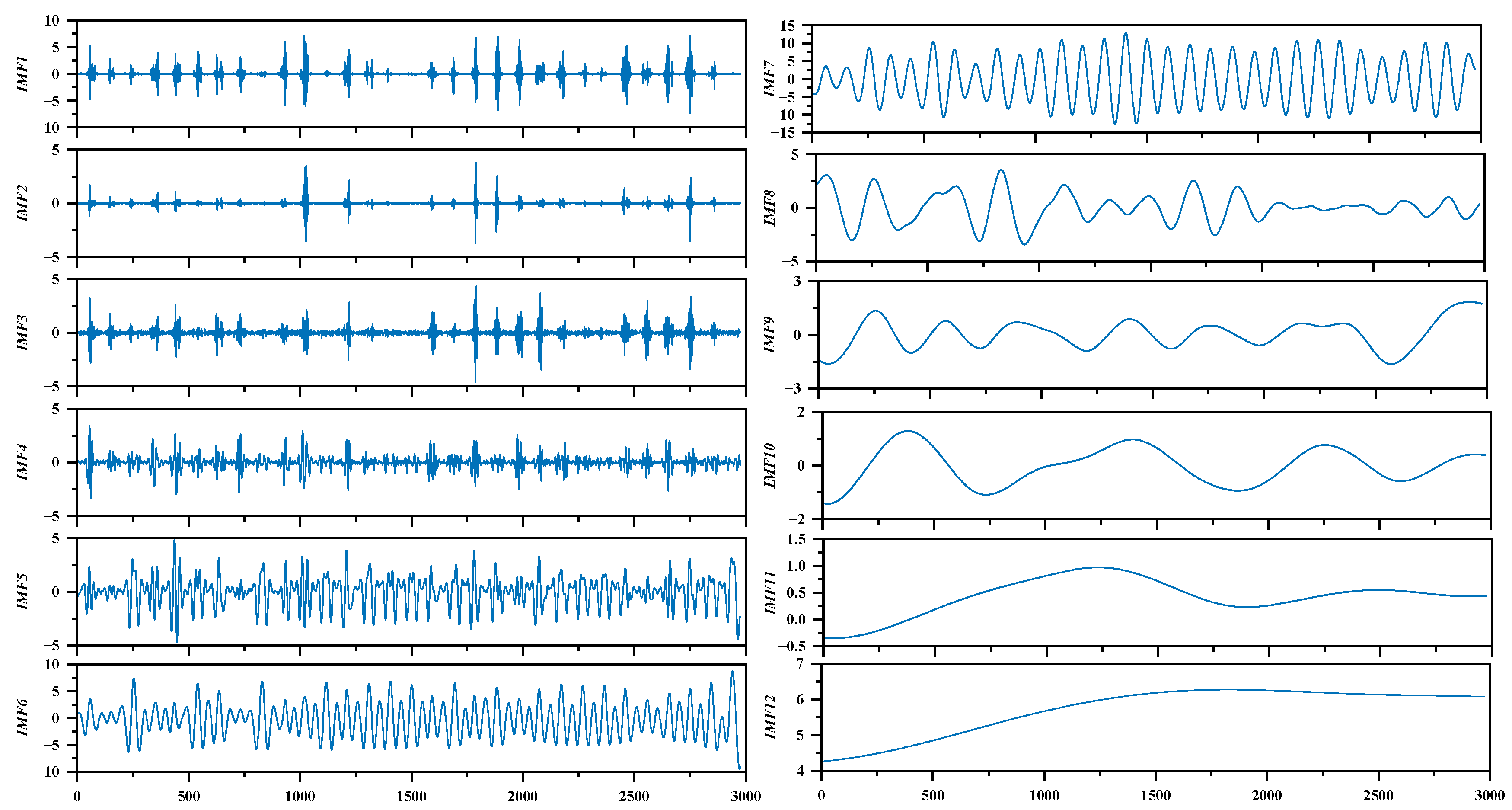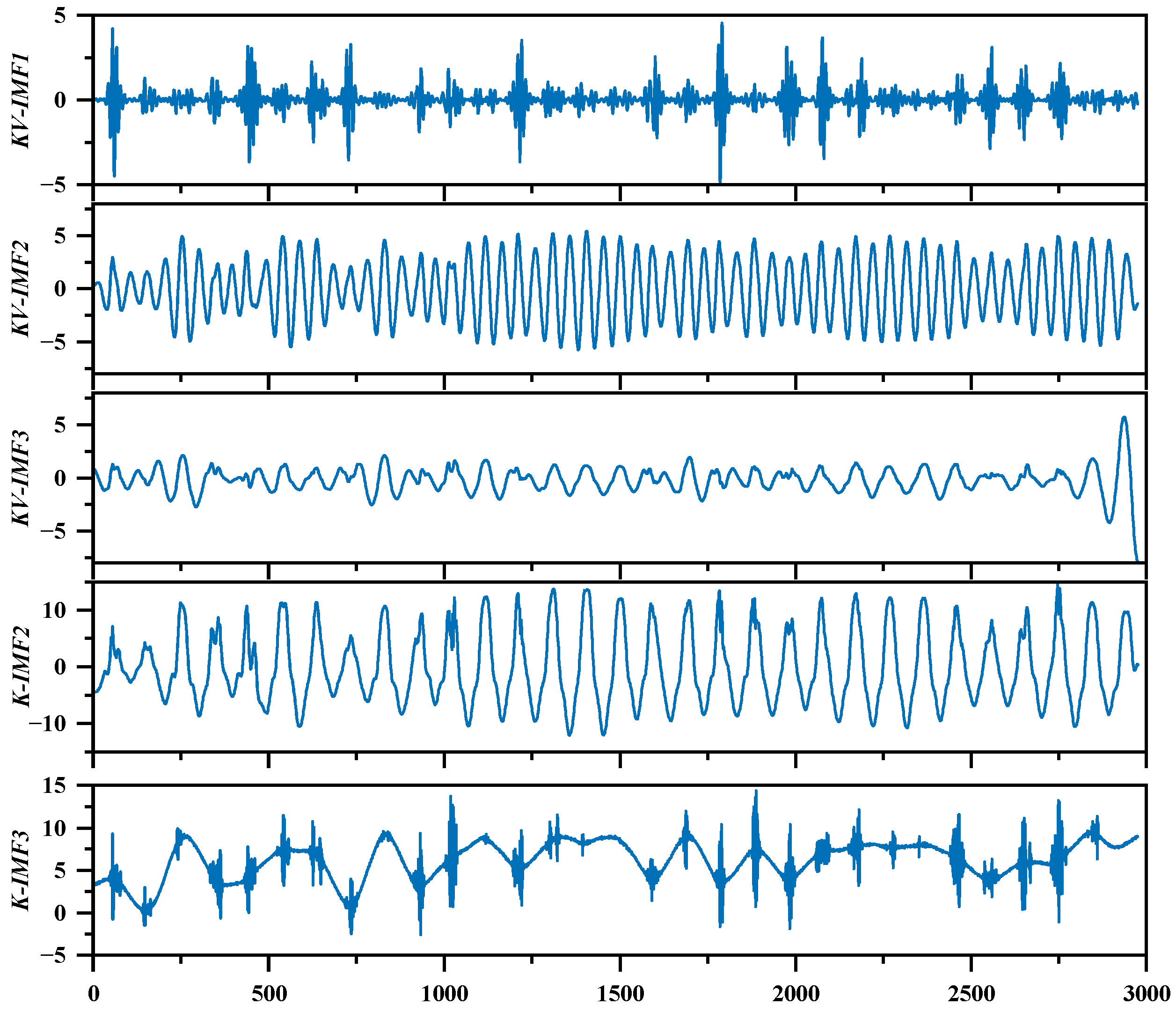 (a) The ICEEMDAN algorithm is employed to decompose the original dataset and extract feature signals across various frequency bands. Subsequently, K-means clustering is utilized to segment these decomposed feature signals into several subsequences, thereby delving deeper into the underlying structure of the data. In the final step, VMD is applied to further decompose each subsequence, thereby extracting more refined feature details.