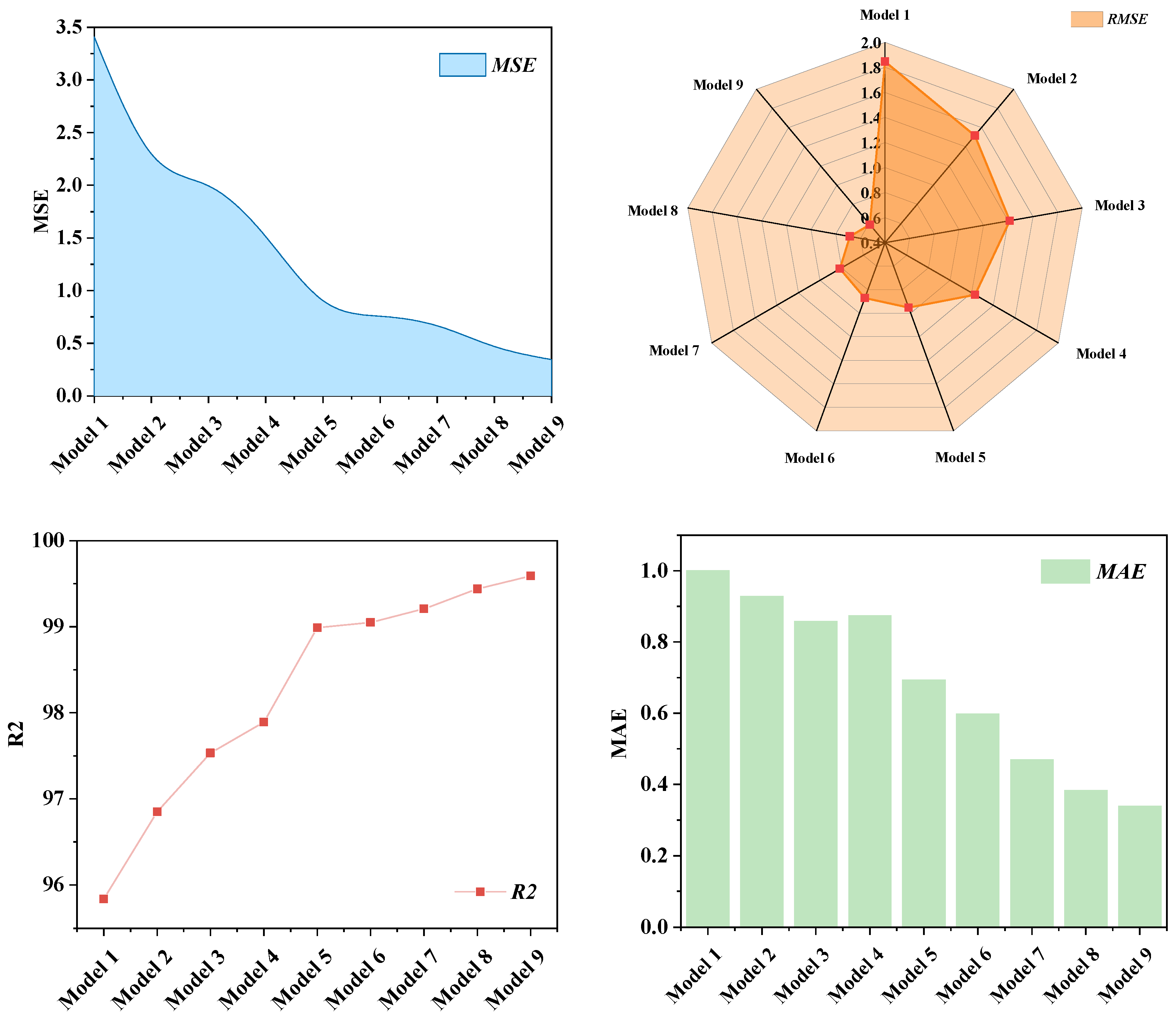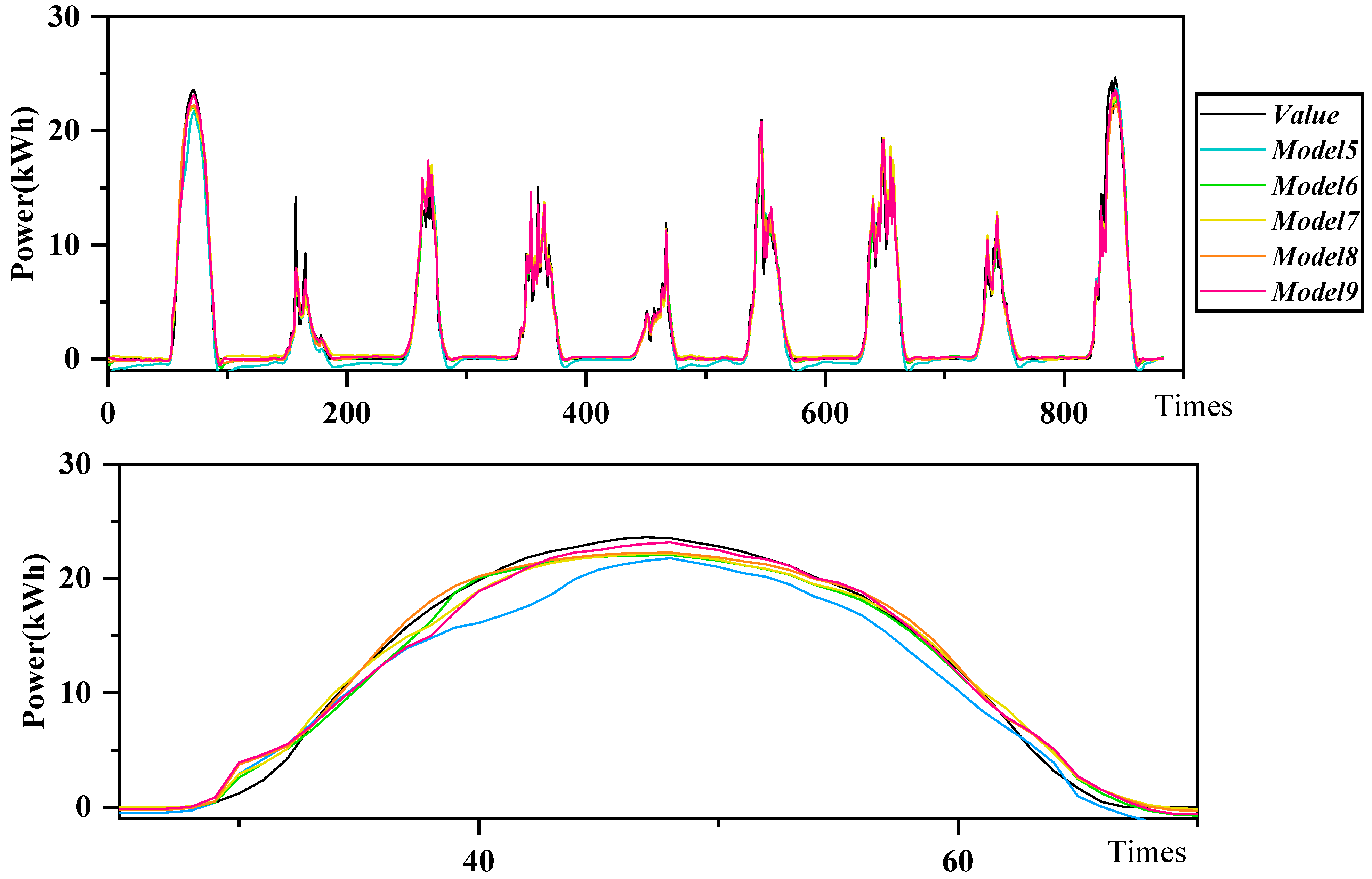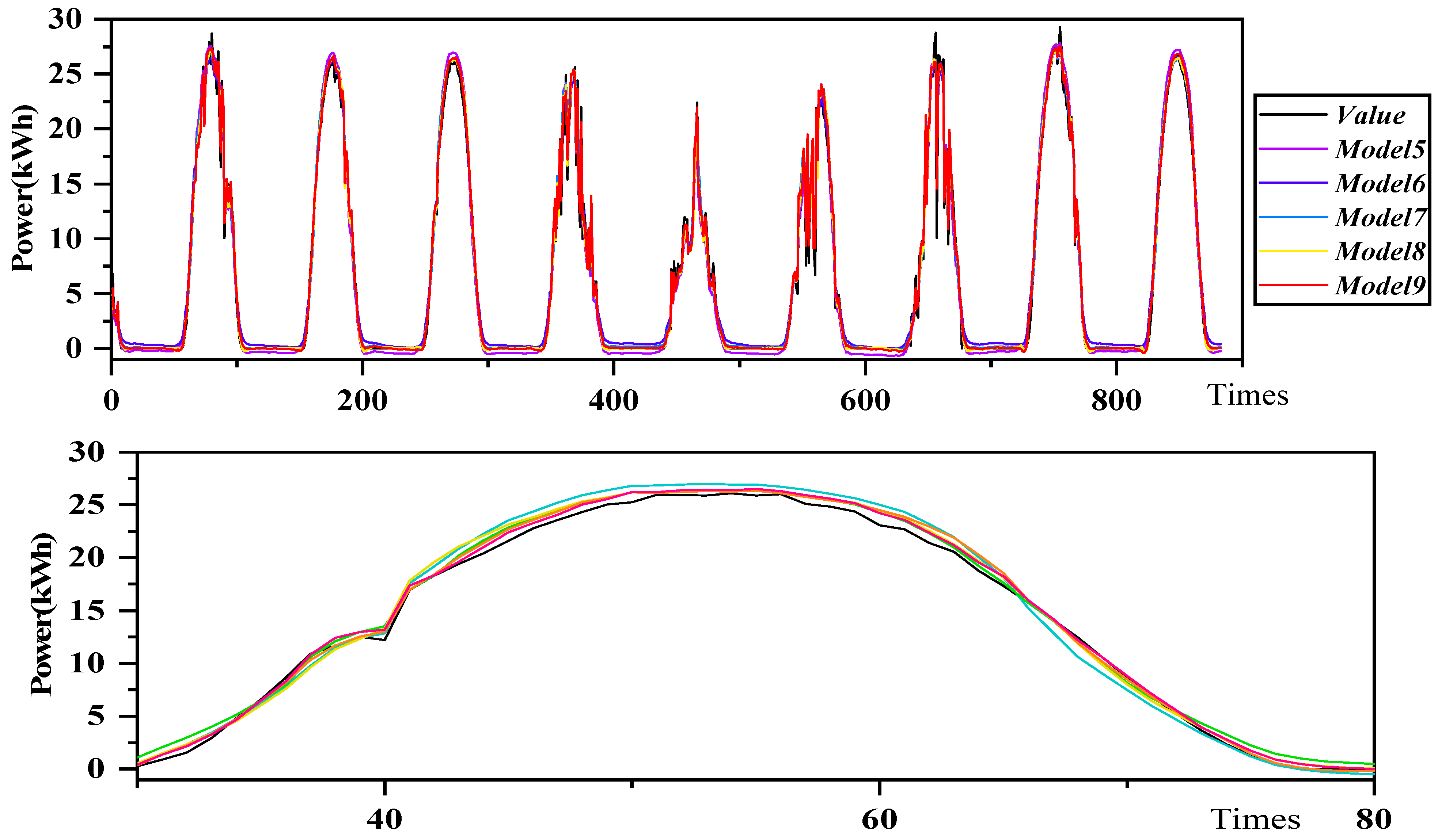 (c) Hybrid learning models have better prediction accuracy than single prediction models. Each PV power sequence has different features and attributes, which makes it difficult for a single prediction model BiGRU to predict various types of sequences. The MSE, RMSE, MAE and R2 of the hybrid learning model are 0.3456, 0.5879, 0.3396, and 99.59%, respectively, which is an improvement of 3.0627, 1.2583, 0.6619, and 3.876% compared to the single model.