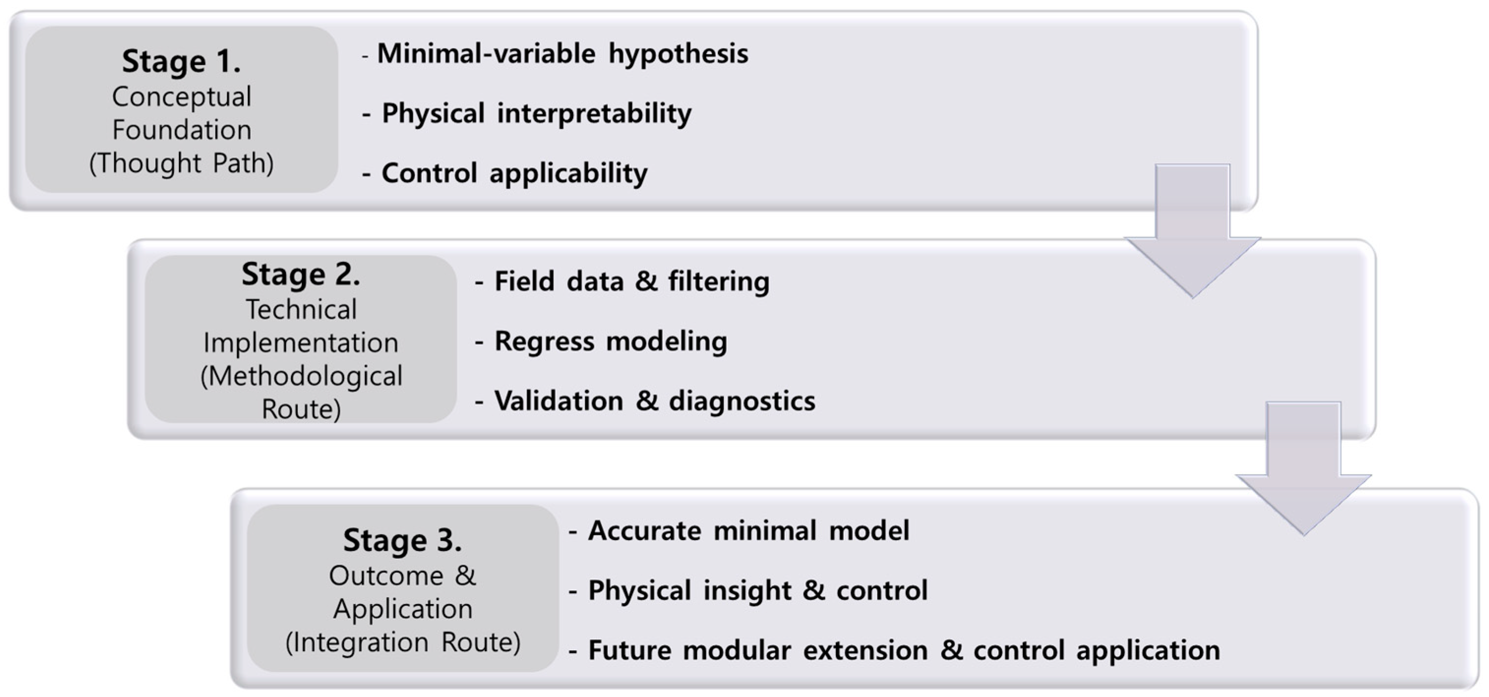 Stage 1 defines the conceptual framework based on physical reasoning, Stage 2 implements field measurement and regression analysis, and Stage 3 validates the model for control-oriented applications.