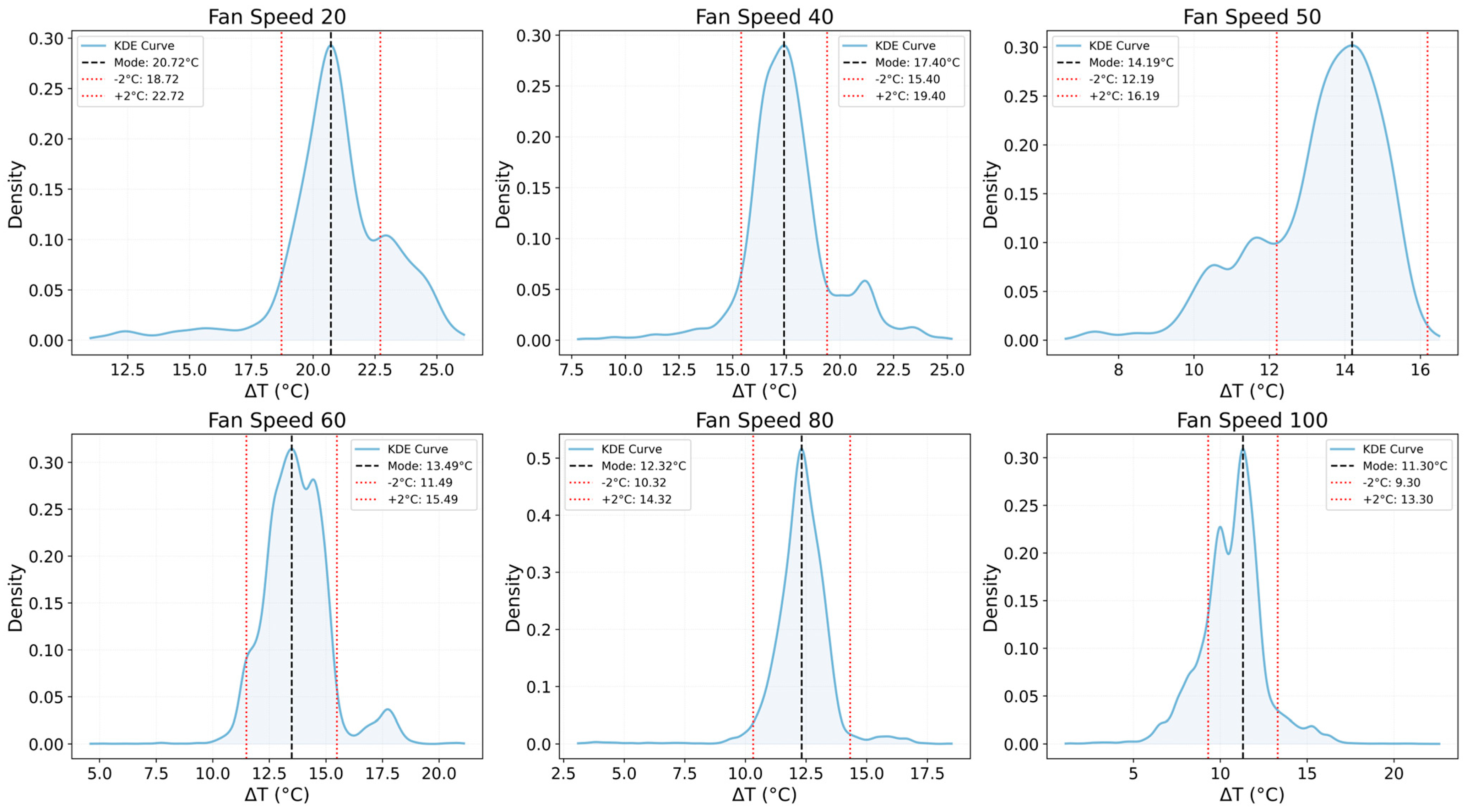 Step 5 Indoor   Δ T   outside   KDE   mode   ± 2 °C (per fan speed)ASHRAE Std. 37 [36]Remove transient disturbances (door opening, airflow fluctuation) inconsistent with steady state