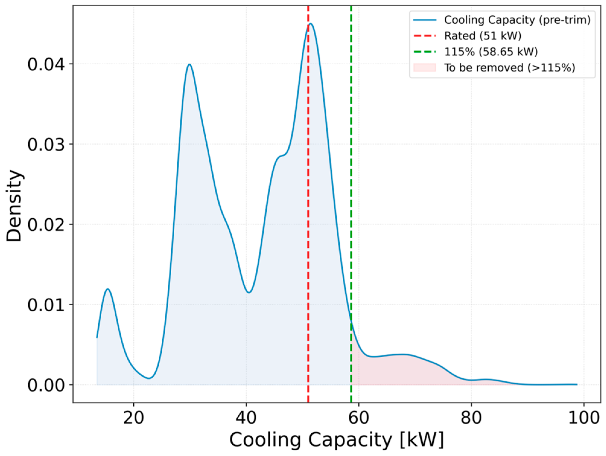 Step 6Top 5% of cooling capacity valuesASHRAE Std. 37 [36]Exclude unrealistic values beyond rated envelope; retain physically plausible performance