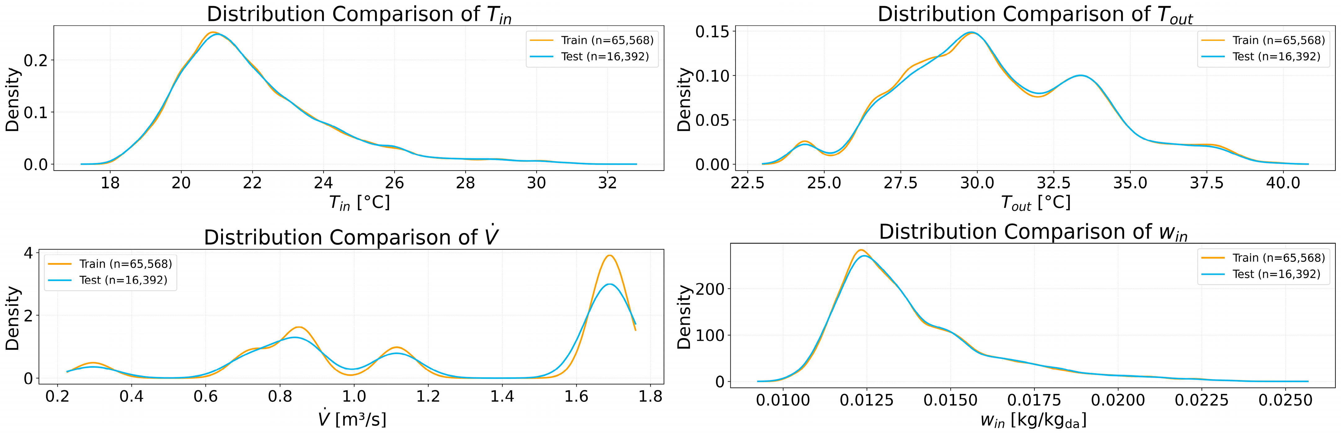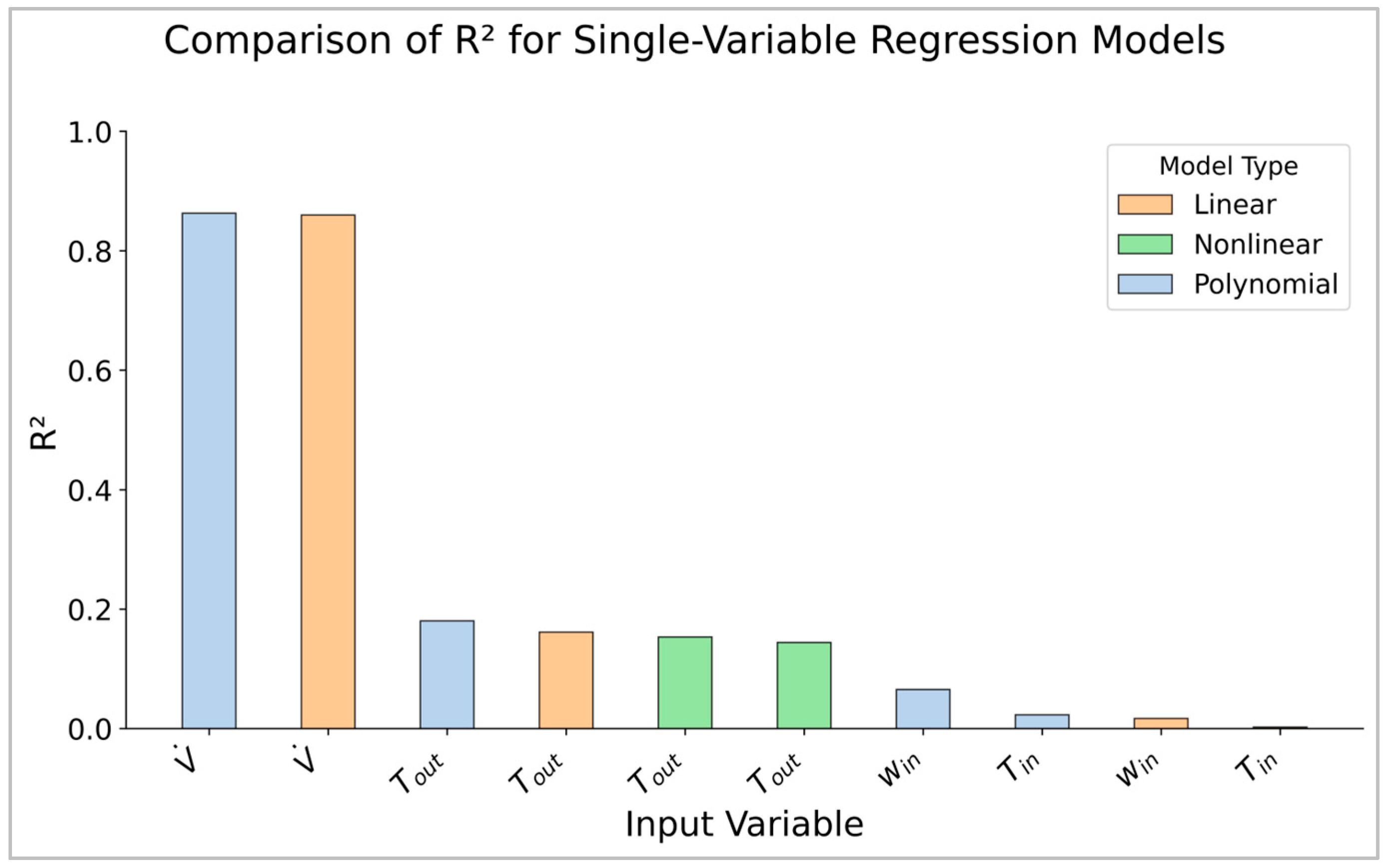 Polynomial Regression (degree = 2)Reflect nonlinear effects and interactions between variables Q ˙ c = a + b1·Tin +b2·Tout + b3· V ˙   +b4·win + b11·Tin2 + b22·Tout2 + b12·(Tin·Tout)Constructed up to second order; higher orders avoided due to overfitting risk