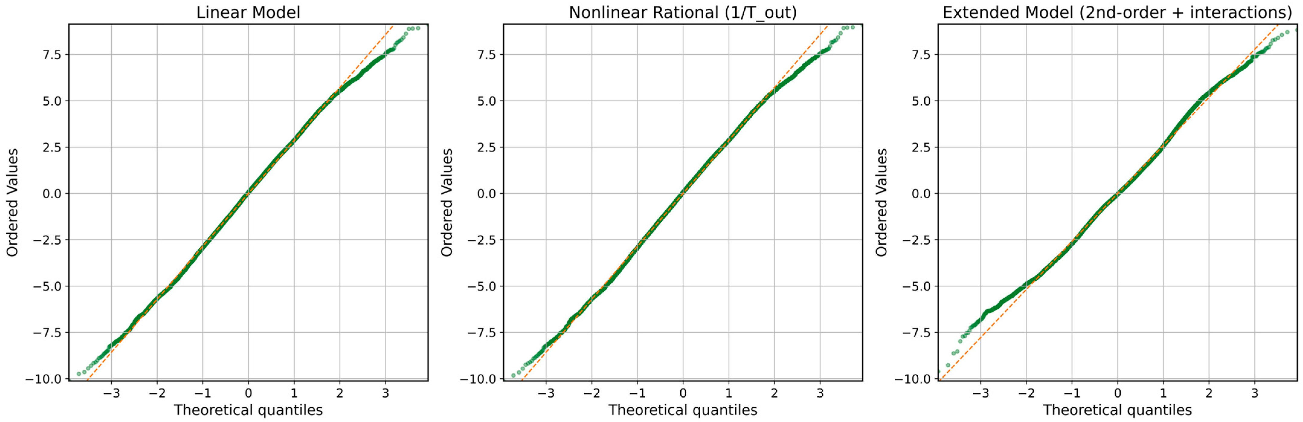Figure 10. QQ plots of residuals for the linear, rational (1/Tout), and extended nonlinear (second-order + interaction) models. The orange dotted line indicates the theoretical normal quantiles (ideal reference line), while the green line represents the ordered sample residuals.