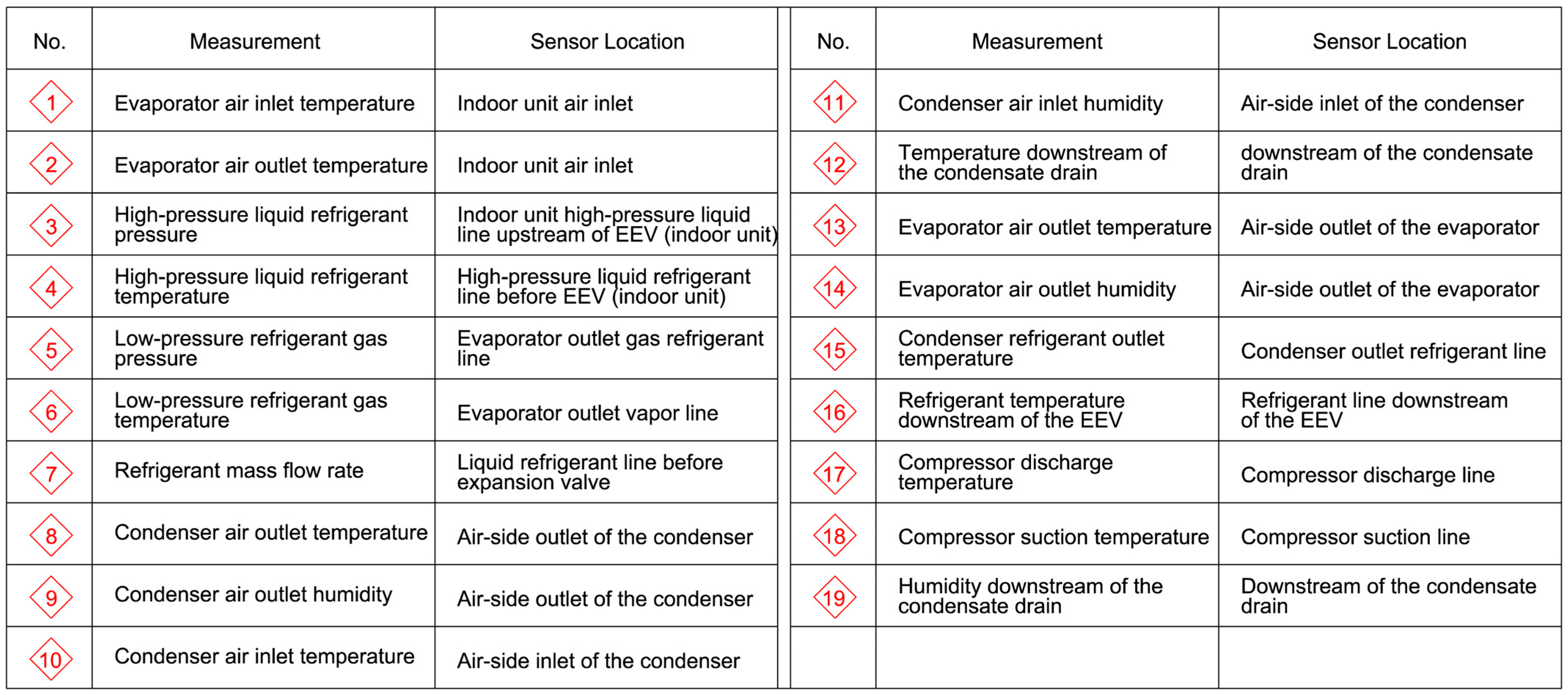 The measuring instruments were installed to monitor both air-side and refrigerant-side parameters for comprehensive performance evaluation under various operating conditions.