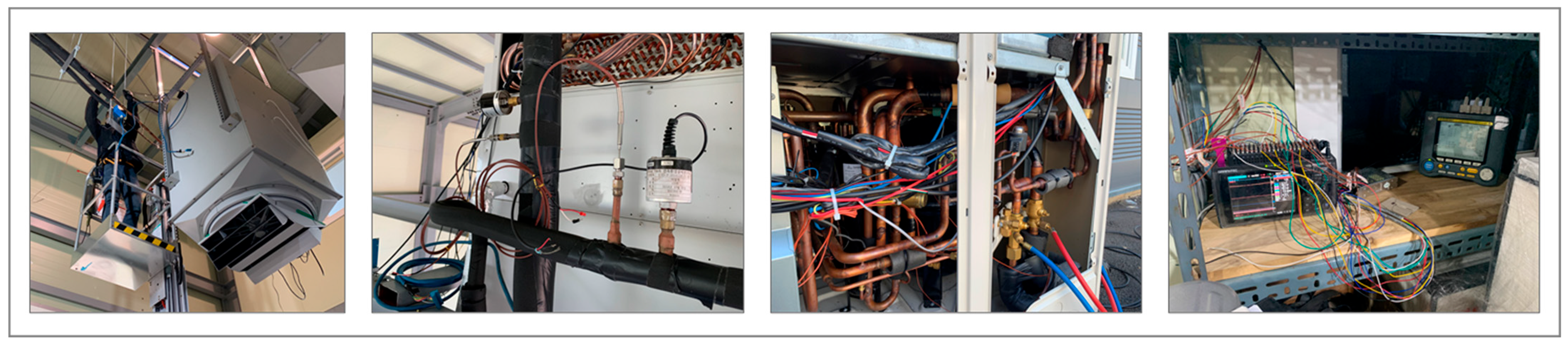 In this study, calibrated sensors were installed to measure both air-side and refrigerant-side state variables as well as the system power consumption. Indoor and outdoor air temperatures and relative humidity were monitored using temperature–humidity sensors, while additional T-type thermocouples were used to record air and refrigerant temperatures at key locations. The refrigerant-side pressures and mass flow rate were measured using pressure transducers and a Coriolis-type mass flow meter, respectively, and the total power input was recorded through a digital sampling power meter.