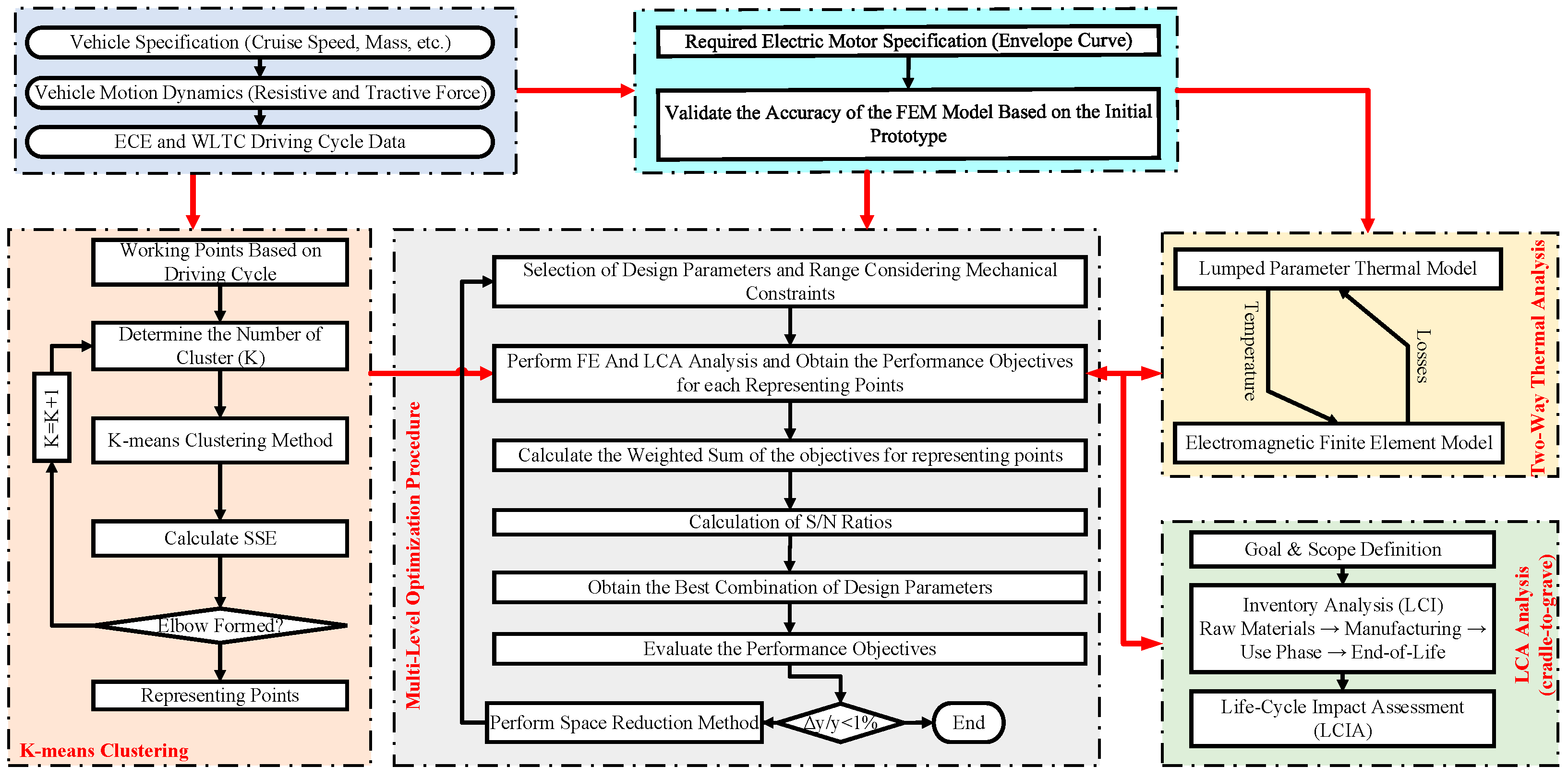 This section presents the methodological framework applied in this study. First, a flowchart is provided to summarize the complete workflow from driving cycle analysis to life cycle interpretation. Then, the motor under study and its main electromagnetic and thermal characteristics are described. Finally, the LCA procedure is detailed, including boundary conditions, databases, and assumptions. The detailed formulation of the optimization algorithm and weighting strategy is presented separately in Section 3.
