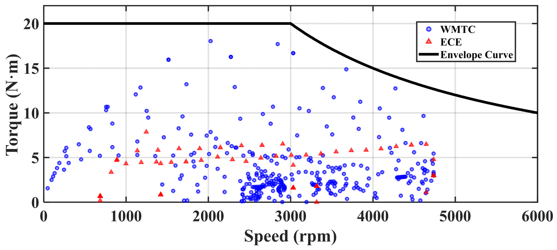 The resulting operating map demonstrates that the motor predominantly functions within the constant torque region up to around 3000 r/min, after which it transitions into flux-weakening operation. Figure 3 illustrates the complete distribution of the working points together with the required torque–speed envelope curve. This envelope provides the performance boundary that the machine must satisfy throughout the cycles, defining both the peak torque needed for acceleration and the extended speed range required for cruising.