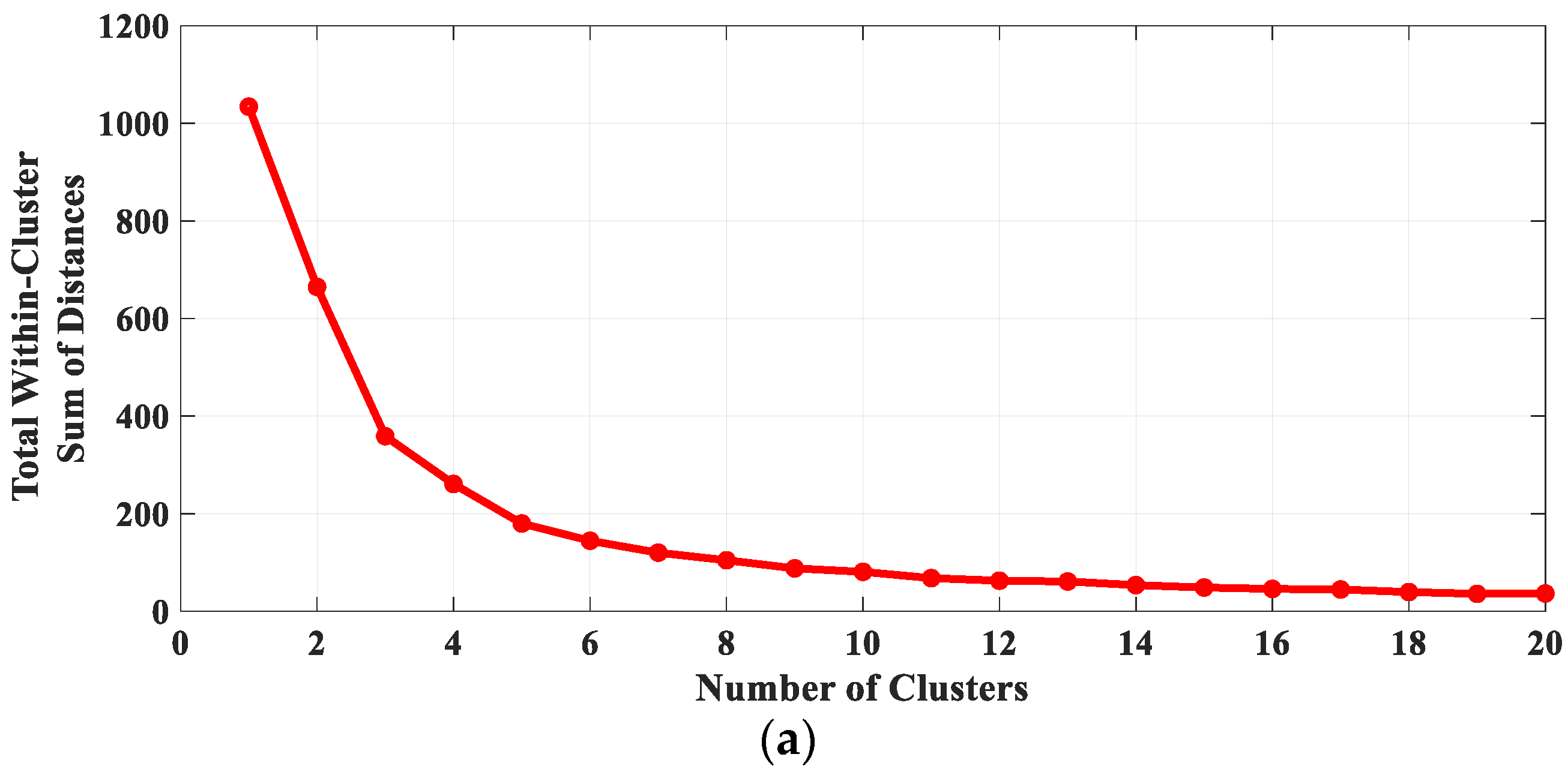 Figure 4. (a) The optimum number of k-means clusters and (b) the detail of the clusters and representing points.