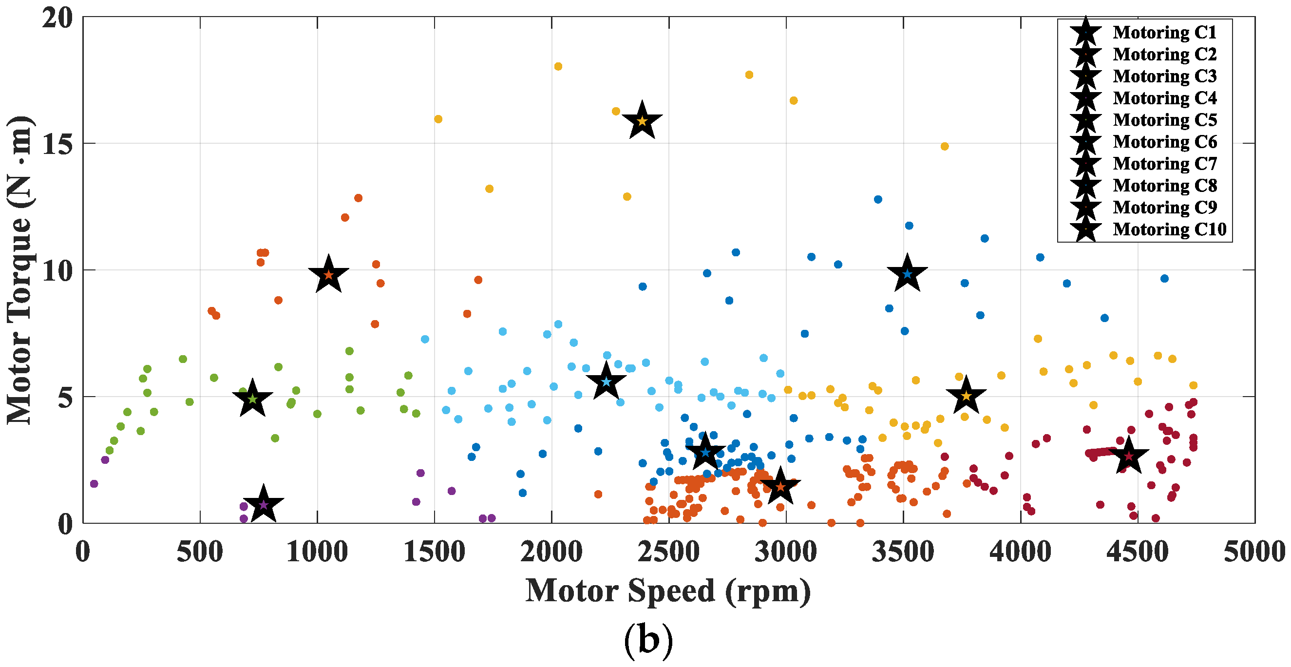 After clustering, the centroid of each cluster was defined as a representative operating point for optimization. Figure 4a shows the elbow criterion used to select the cluster number, while Figure 4b illustrates the resulting partitions of the operating points across the torque–speed map. The detailed parameters of these representative operating points are reported in Table 4.