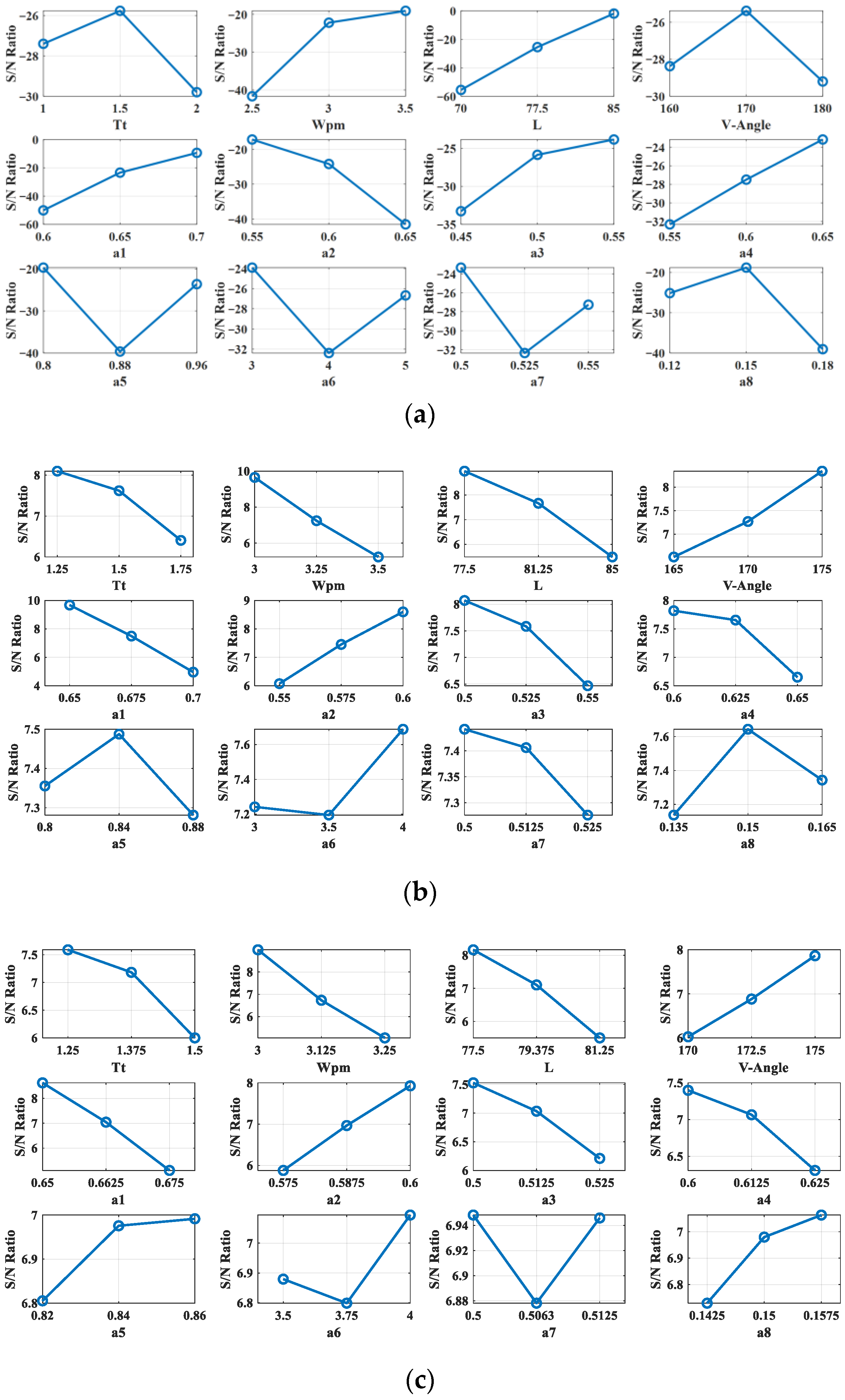Figure 5. Signal-to-noise (S/N) ratio plots for three successive Taguchi iterations: (a) Iteration 1, (b) Iteration 2, and (c) Iteration 3.