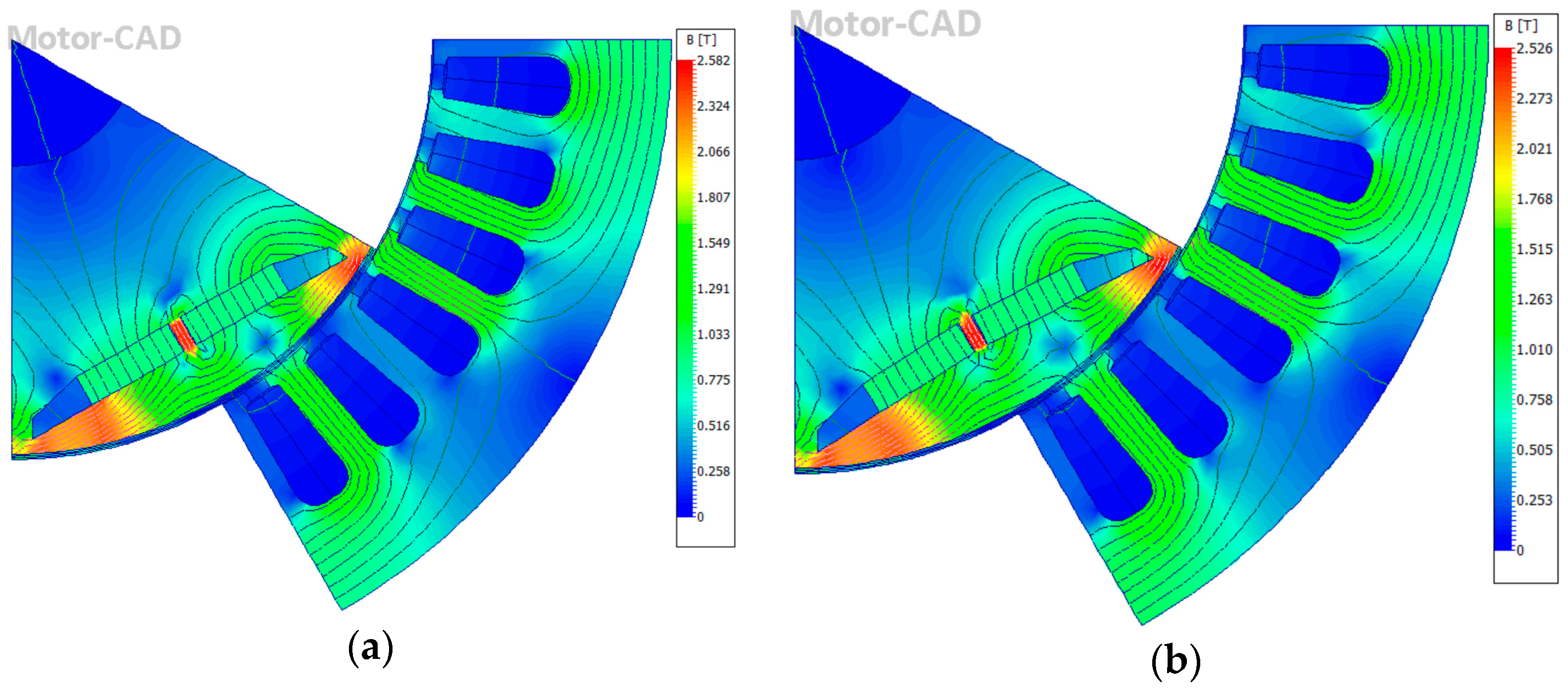 The magnetic flux density distributions of the initial and optimized IPM designs are compared in Figure 6. In the initial design, the peak flux density in the stator tooth was 1.73 T, with an average airgap flux density of 0.7232 T. After optimization, these values change to 1.81 T and 0.6034 T, respectively. The results indicate that both designs remain well within acceptable magnetic limits, indicating that there is no significant oversaturation in critical regions such as the stator tooth and back-iron. This confirms that the optimum design maintains a proper flux density distribution.