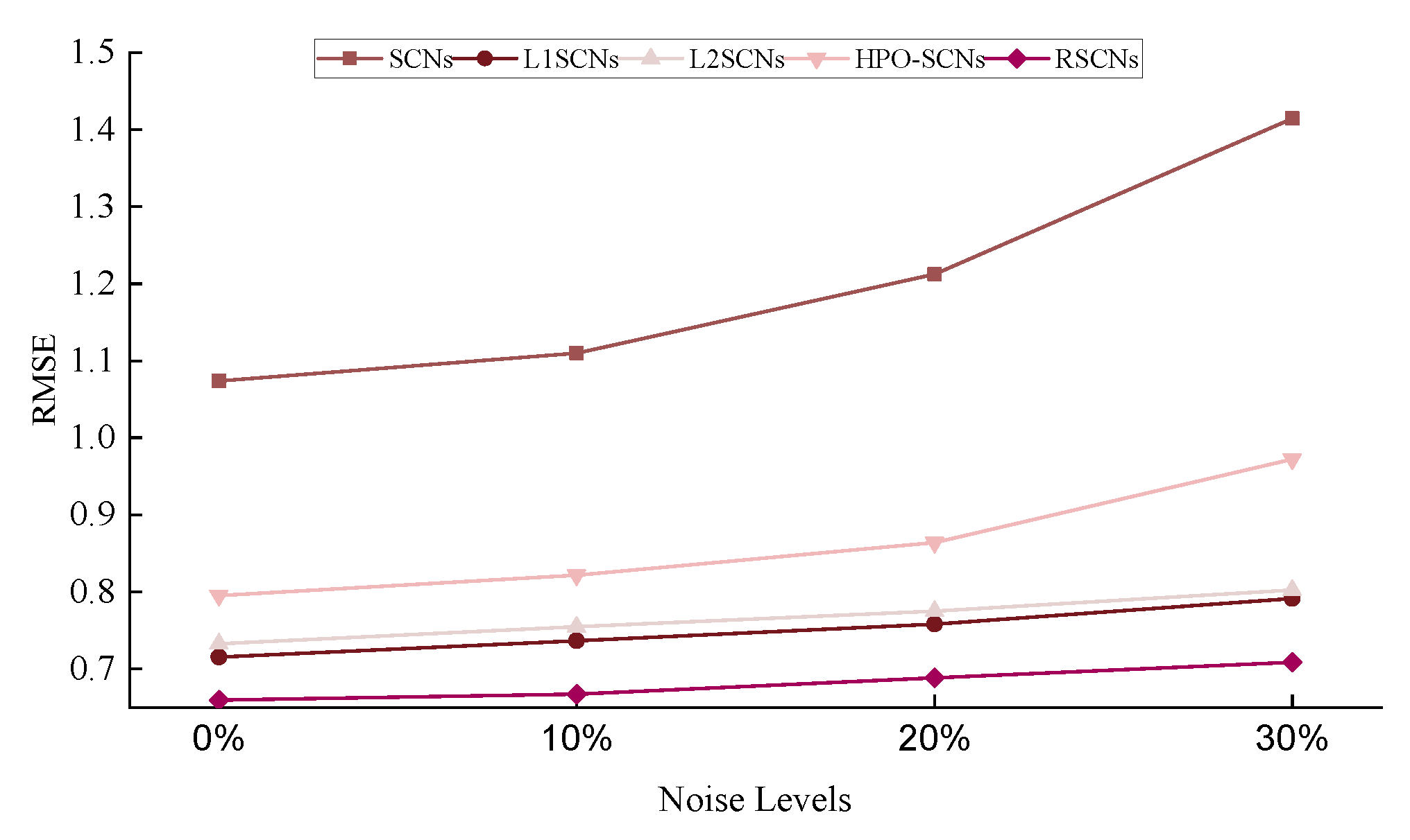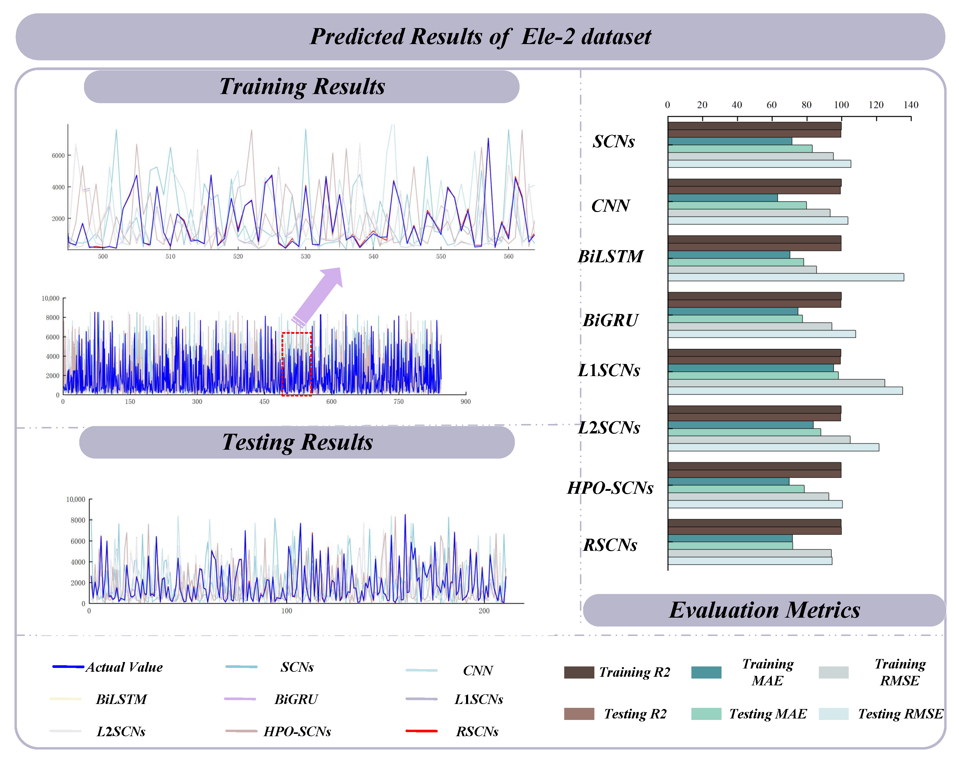 | Ele-2 | SCNs | 0.9976 ± 0.0010 | 71.4170 ± 7.2304 | 95.2537 ± 9.6631 | 0.9951 ± 0.0010 | 86.7361 ± 7.9880 | 107.8005 ± 10.7783 |