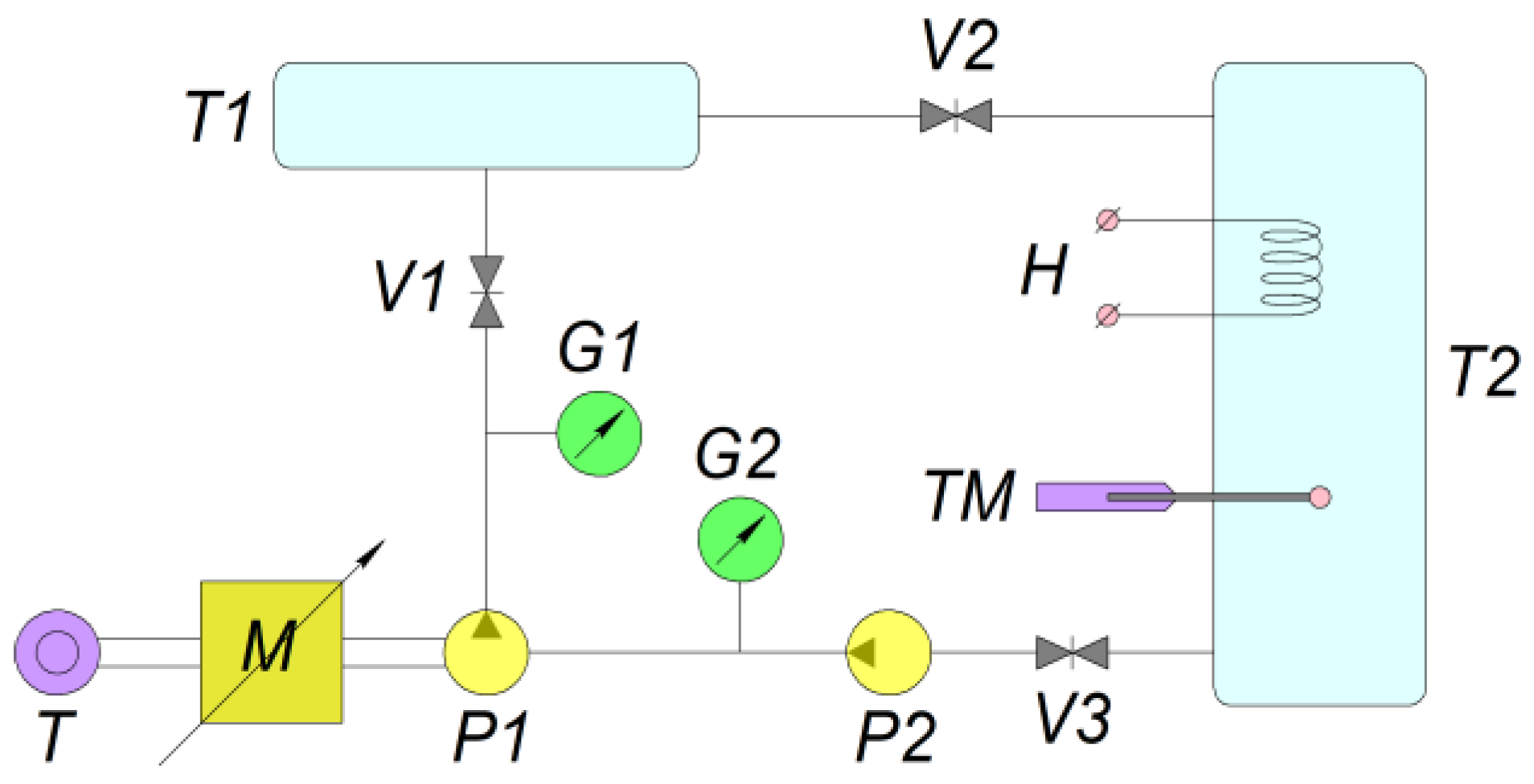 To measure the temperature of the pumped liquid, a mercury thermometer of accuracy class 0.1 with a measurement range of 0–100 °C was used in the circuit of the experimental stand to measure the temperature of the working liquid in the system; its readings were used to determine the start time of the tests for the selected value of the viscosity of the pumped liquid.