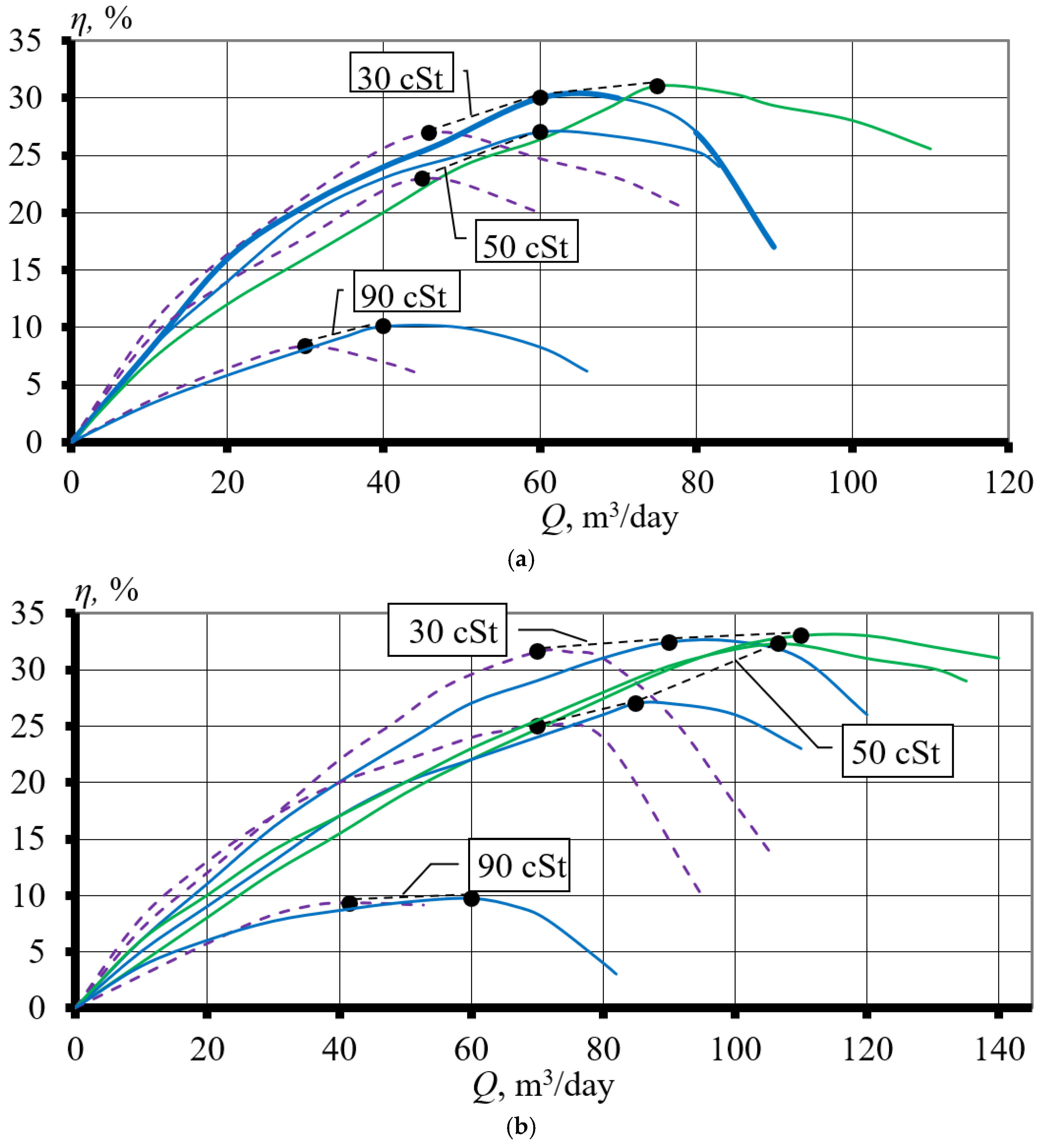 Second, at low productivity and high viscosity, due to the pump’s low energy efficiency, rapid heating of the pumped liquid in the flow channels occurs at high rotational speeds. As a result, the viscosity of the pumped medium decreases, which leads to a subsequent reduction in energy losses in the pump. Obviously, this is connected, first, with changes in the value of energy losses due to disk friction.
