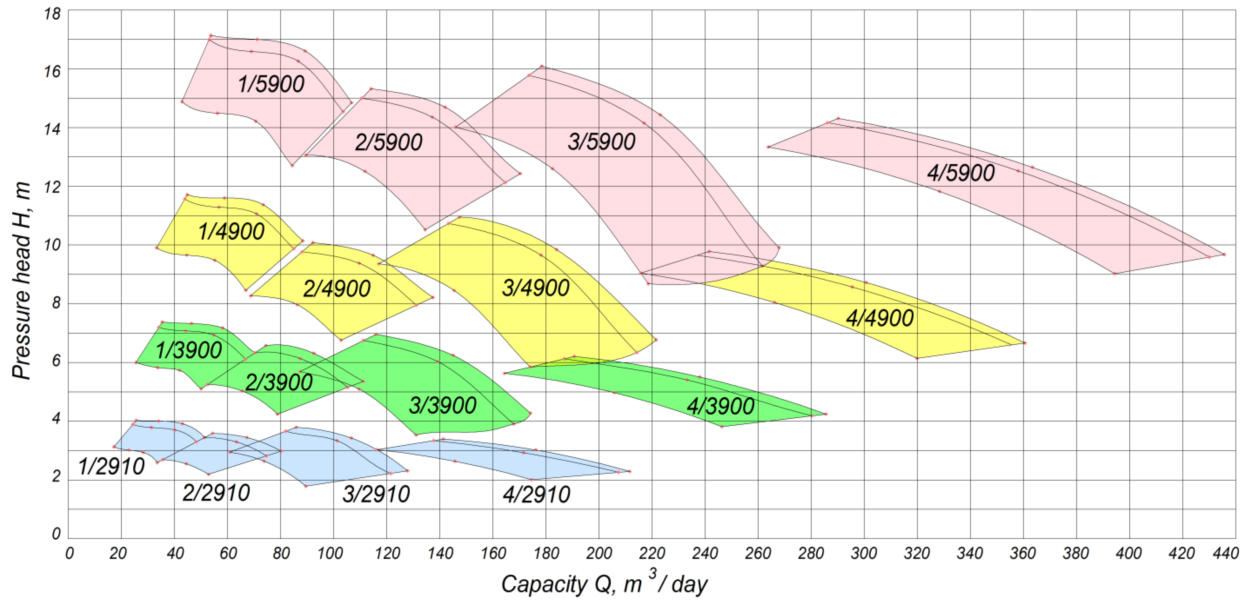 For pumping liquids with maximum viscosity values (relative to the technique’s allocated area of applicability), recalculation should be carried out for pumps with higher productivity and energy efficiency, as obtained on water.