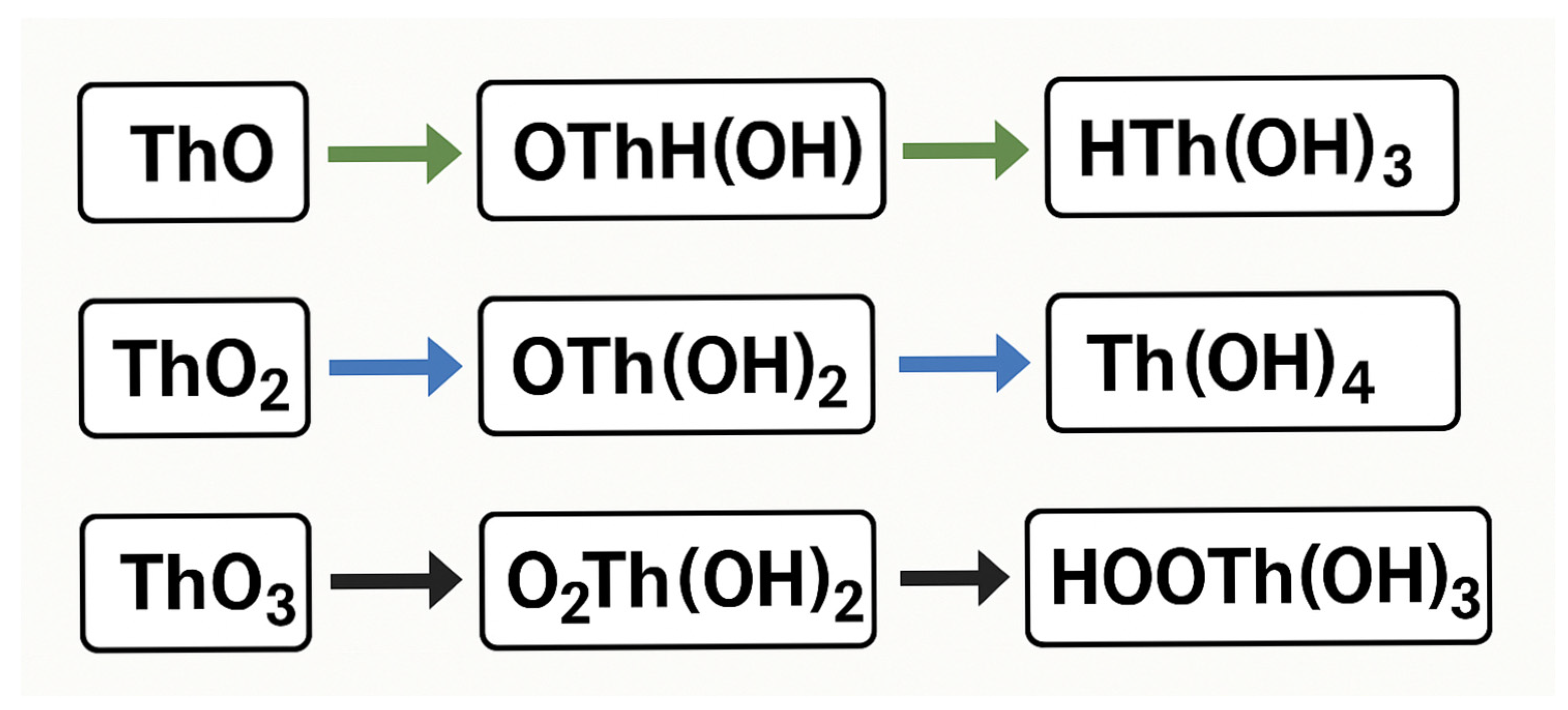 - Wang, B.; Ye, S.; Zhang, S.; Fang, H.; Zhang, Y.; Xia, C.; Chen, W. Reactions of thorium oxide clusters with water: The effects of oxygen content. ChemPhysChem 2022, 23, e202200701. [Google Scholar] [CrossRef]