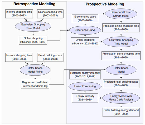Traditional energy demand models, which primarily focus on economic and technological determinants [4,5,6], often fail to capture the evolving complexities of modern consumption patterns, leading to gaps in policy design and implementation. For instance, understanding how digitalization, remote work, and e-commerce reshape energy use is essential for developing responsive and adaptive energy policies [7,8,9,10,11,12]. These behavioral shifts, driven by evolving consumer habits and technological advancements, can significantly alter energy consumption patterns [13,14]. For example, the COVID-19 pandemic accelerated the transition to e-commerce, leading to a marked increase in online shopping activities [13], and also drove widespread adoption of remote work, reduced commuting and driving. All of which have had profound implications for energy demand and consumption. Additionally, studies have examined factors driving consumer involvement in energy consumption and the effectiveness of behavioral interventions to reduce household energy demand [14,15]. Among these behavioral shifts, the growth of e-commerce stands out for its potential to reshape the retail sector by changing how much physical store space is needed. This in turn can have substantial implications for energy demand in retail buildings, which is a critical component of urban energy use.