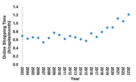 The future in-store shopping time is predicted based on the historical online shopping time and the interactive relationship between in-store and online shopping times illustrated in Equation (7). Figure 2 illustrates the historical monthly online shopping time from 2003 to 2023. The data reveals two distinct phases. From 2003 to 2014, online shopping time exhibited relatively modest annual growth (average +0.022 h/capita/month), with minor fluctuations. However, starting in 2015, there was a rapid annual increase in online shopping time (average +0.074 h/capita/month). This shift reflects some combinations of advancements in e-commerce platforms, improved logistics systems, and growing consumer preferences for online shopping.