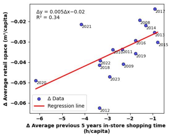 The best-fit regression model (# of years to average previous in-store shopping time n = 5 years) linking the year-to-year change in average retail space per capita to the change in the 5 year moving average of in-store shopping time per capita in the U.S. at the national level. See Equations (1)–(4). The choice n = 5 yields the lowest p-value for the regression coefficient (p-value = 0.02) and the highest (0.34) among all tested time lag windows (1–10 years). The regression line indicates a significant positive relationship, suggesting that a decline of one hour per year per capita in the 5-year average of in-store shopping time corresponds to a reduction of approximately 0.005 m2/capita in retail space.