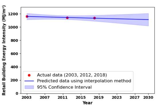 Next, the future retail building energy demand can be predicted by multiplying the predicted retail building space by building energy intensity. Energy intensity, defined as energy consumption per unit of floor space, is a key metric for estimating retail building energy demand based on space [45]. The CBECS database provides energy-related building characteristics and energy consumption data, including retail building floor space and corresponding major fuel consumption, including site electricity, natural gas, and fuel oil, for a given calendar year. Using this data, retail energy intensity can be calculated with the following equation: