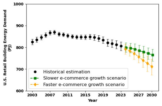 The projected retail space and retail building energy demand with 95% confidence intervals in the U.S. from 2024 to 2030 is shown in Table 4. We can see that the faster e-commerce growth scenario shows a sharper decline in both retail space and retail building energy demand compared with the slower e-commerce growth scenario. The historical and projected retail building energy demand from 2003 to 2030 is shown in Figure 5. The black error bars represent historical energy demand estimates, while the green and yellow error bars illustrate the projected energy demand under slower and faster e-commerce growth, respectively. The historical estimation is computed based on Equation (11), and the uncertainty comes from the interpolation procedures of retail index and retail energy intensity based on three years of surveyed data from CBECS [31]. As shown, historical energy consumption in retail buildings has declined gradually from approximately 830 PJ in 2003 to about 810 PJ in 2023, suggesting a slow but steady contraction in energy use, reflecting the improvements in energy efficiency and the gradual decline of in-store shopping time.