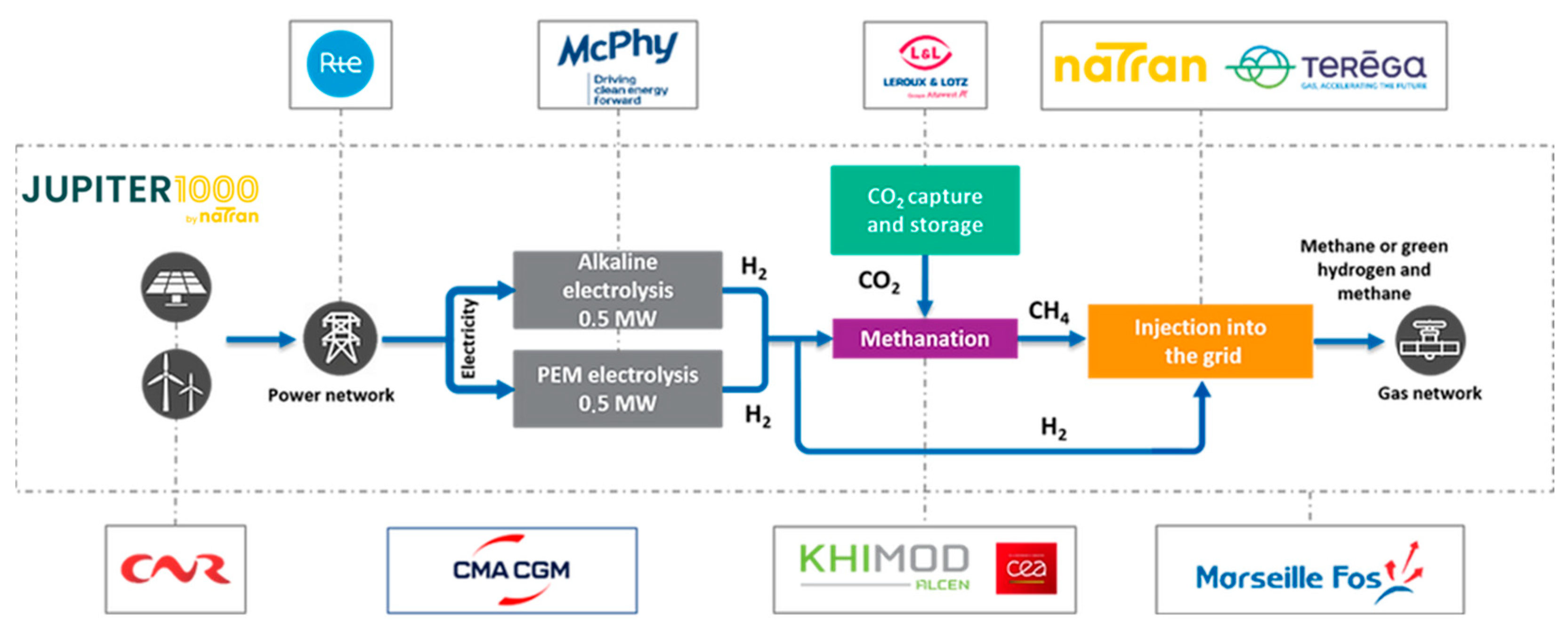 We would like to express our gratitude to all the partners who contributed to the Jupiter 1000 project: CEA, CMA CGM, CNR, GPMM, Khimod, Leroux & Lotz Technologies, McPhy Energy, RTE, Teréga.