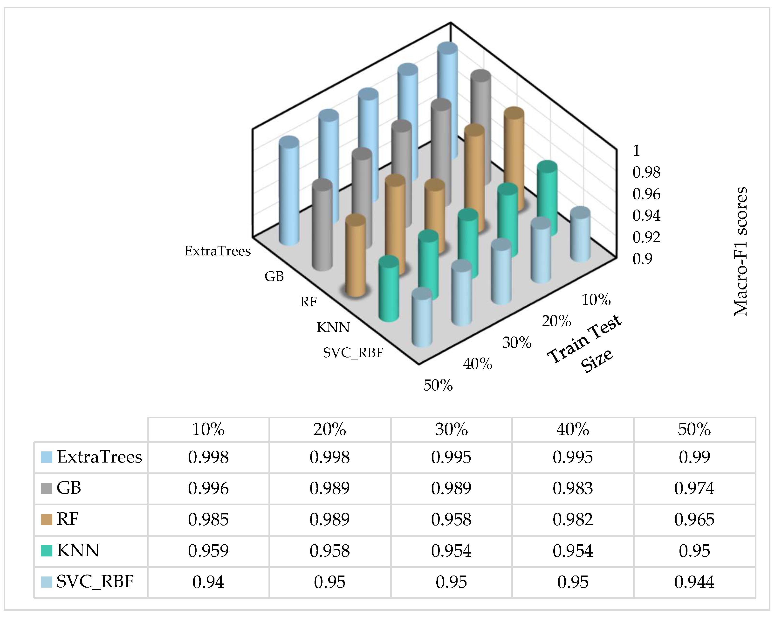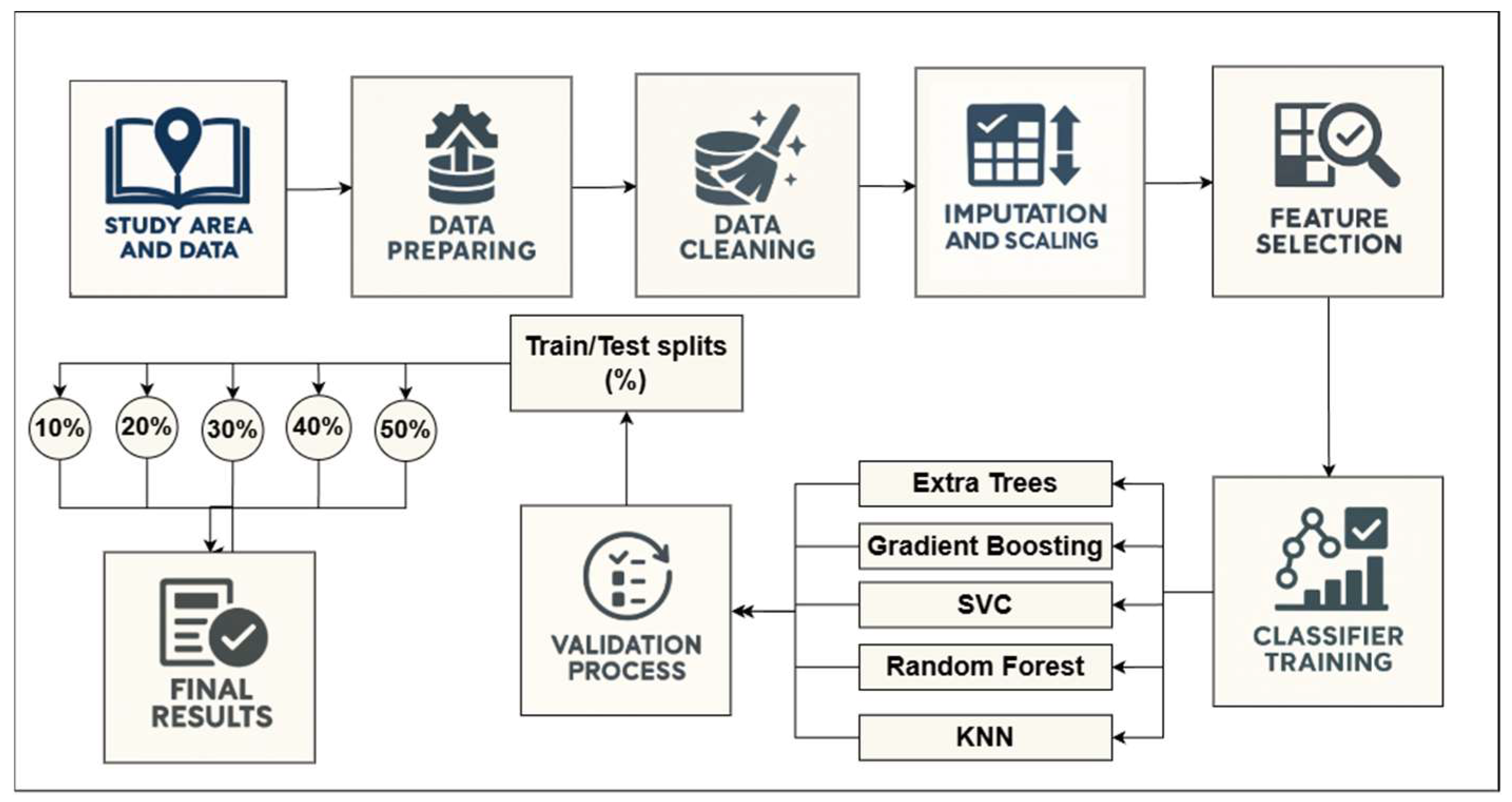 This dual-scenario framework enabled the assessment of how input dimensionality impacts model accuracy, stability, and generalization. After model evaluation, the best-performing classifiers were tested across multiple train-test size partitions (20%, 30%, 40%, and 50%) to determine the optimal data-split ratio for balancing training efficiency and predictive accuracy. This approach led to the identification of the most stable and accurate model configuration, forming the foundation for the final predictive framework in this study.
