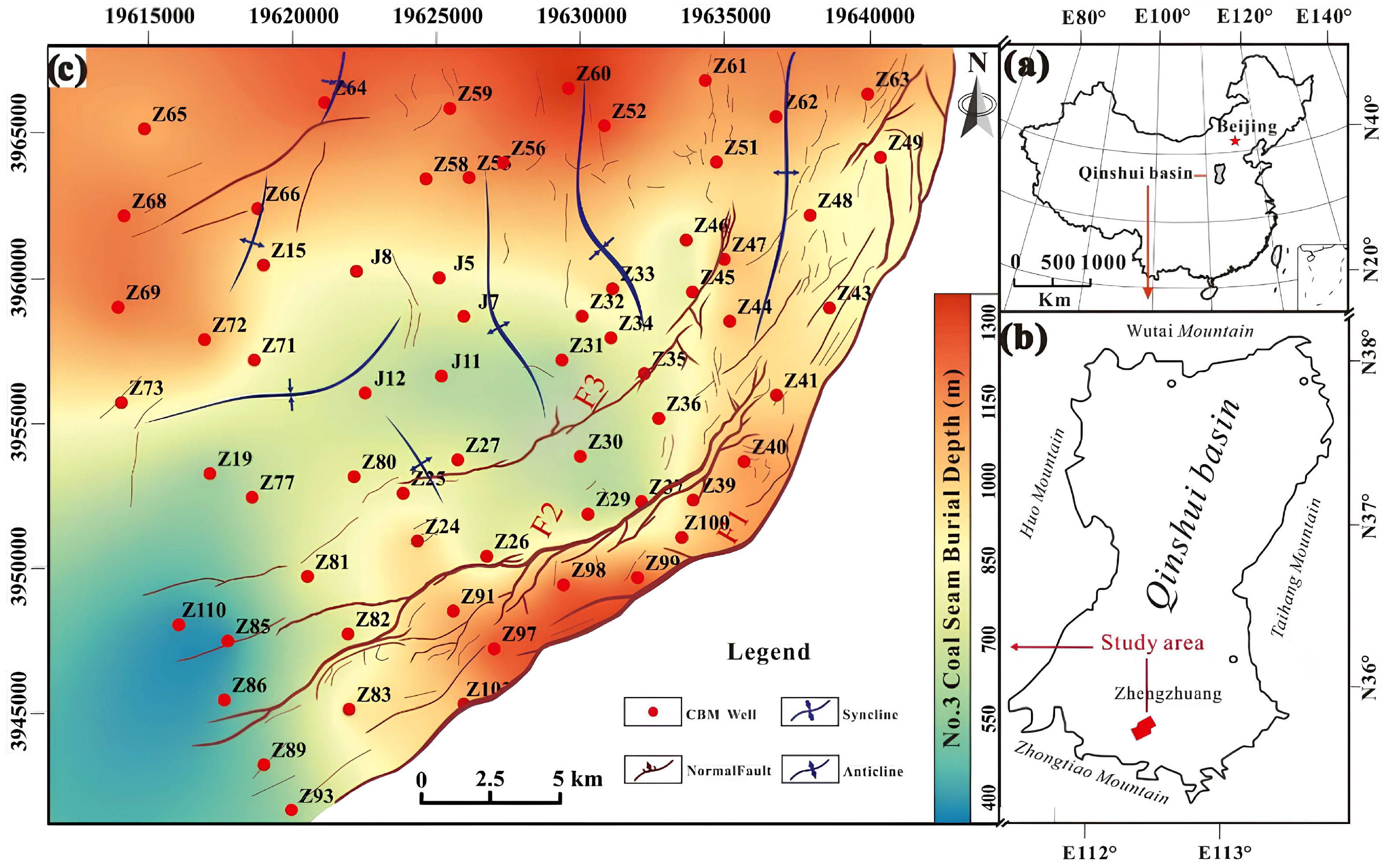The Zhengzhuang Field, located in the central part of the Qinshui Basin, North China, is one of the most significant CBM production areas in the region. The Qinshui Basin is a fault-controlled synclinal basin with extensive coal-bearing strata, primarily of Carboniferous–Permian age. The Zhengzhuang block is characterized by thick coal seams, relatively stable stratigraphy, and well-developed structural deformation, making it an ideal site for coal texture analysis and reservoir characterization.