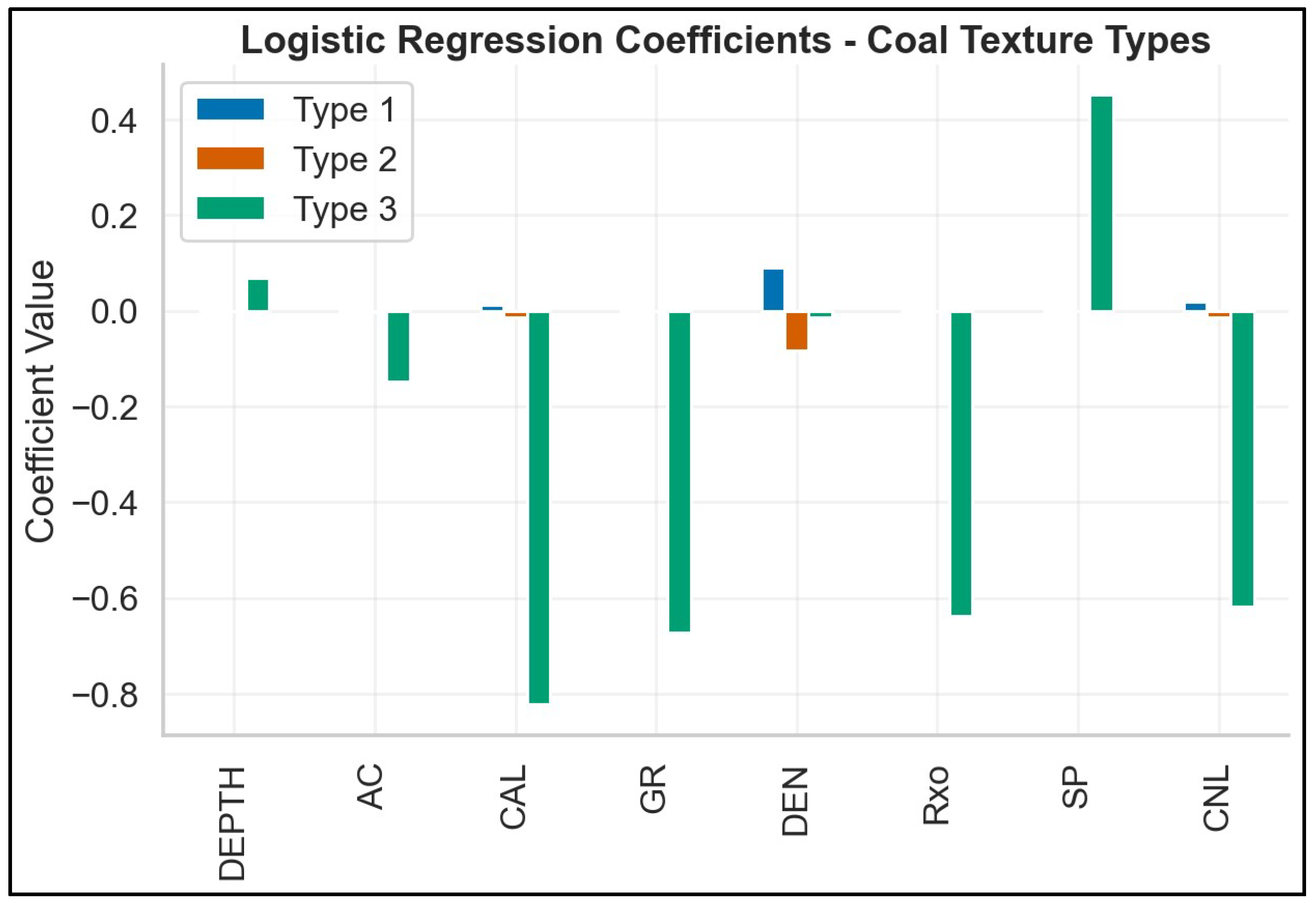 Figure 5 demonstrated that DEPTH, Rxo, and CAL were the most influential parameters in predicting coal texture types, with SP and AC also contributing significantly. Additionally, the multinomial logistic regression coefficients shown in