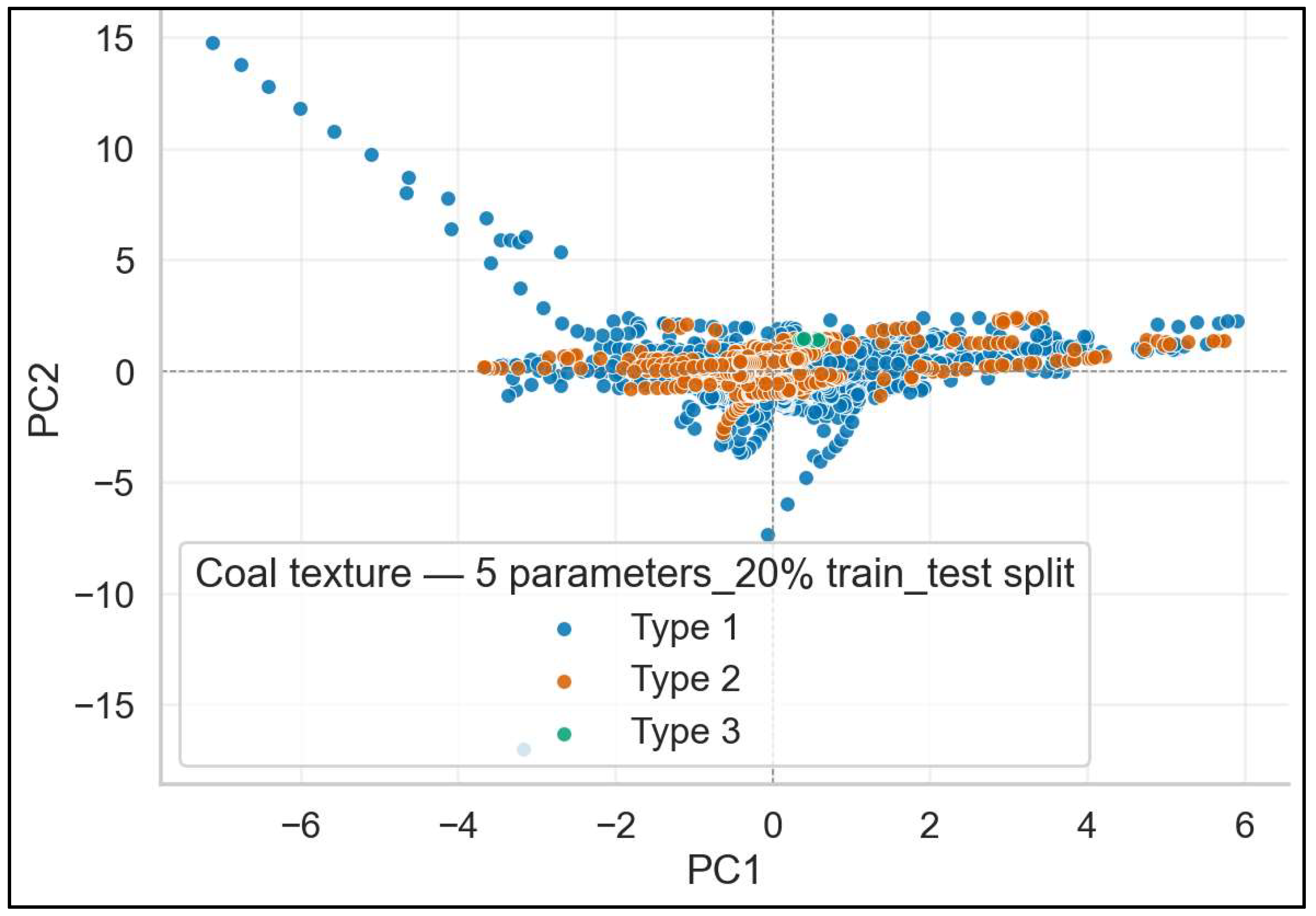 PCA Projection by Coal Texture Type (PC1–PC2) is used to visualize the data in a reduced dimensional space, typically focusing on the first two principal components (PC1 and PC2) derived from Principal Component Analysis (PCA). This method helps to identify the separation between coal-texture classes in the feature space. By plotting the data in this reduced dimensional space, the projection helps visualize the separation of coal textures based on the well-log parameters, providing insight into the effectiveness of the model in distinguishing between the different classes [