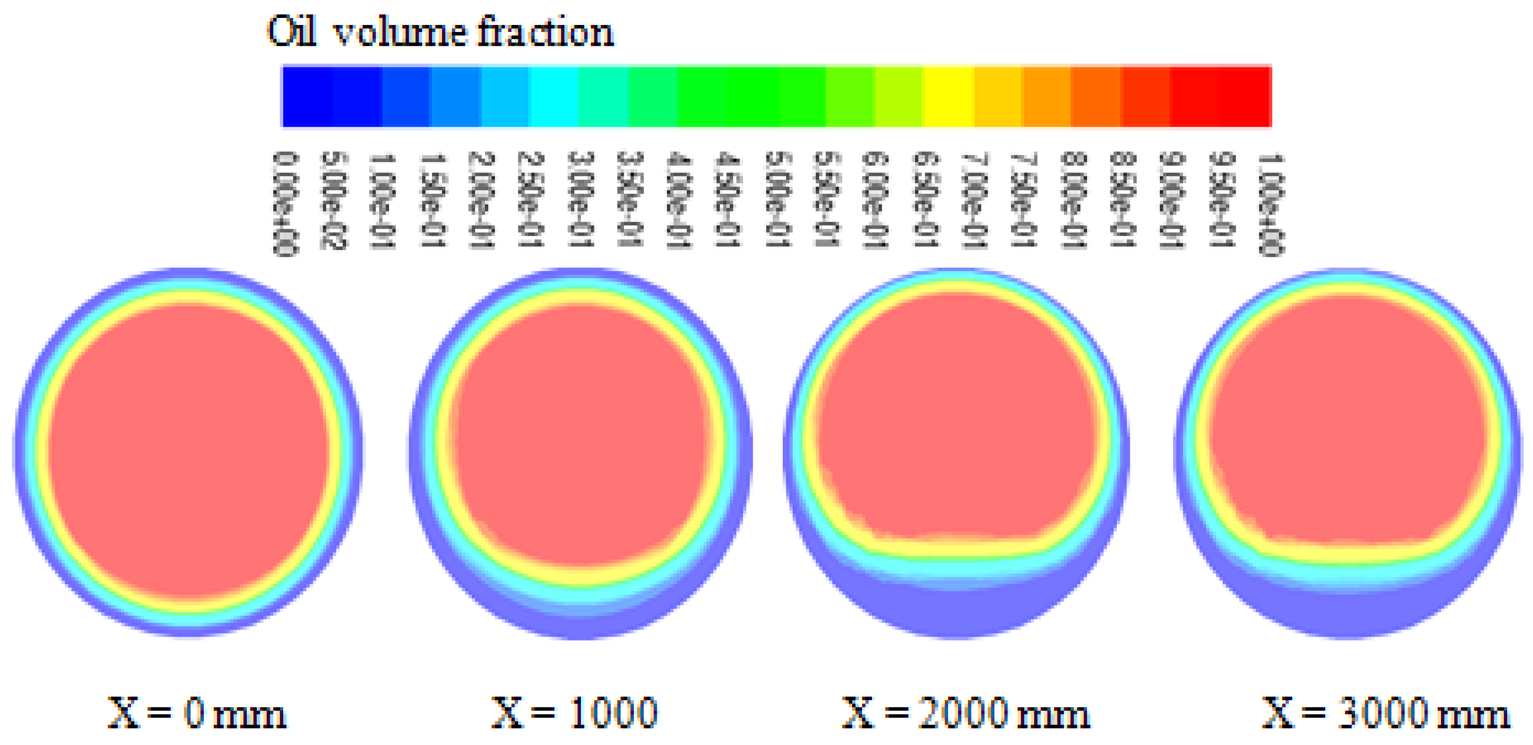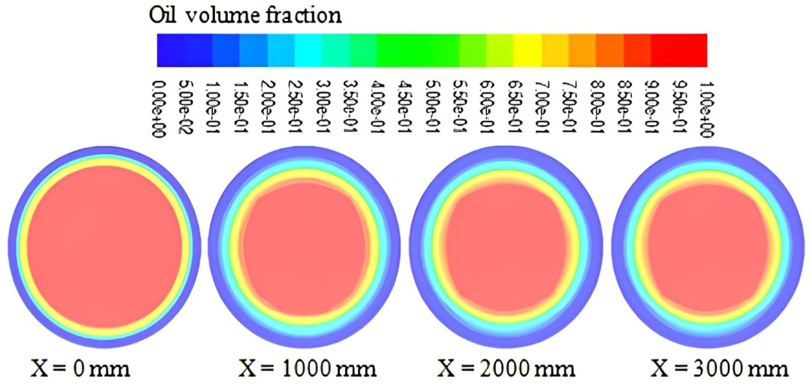 - In the annular space representing the water inlet, the mean velocity and volume fraction of water in the direction of x are presented as follows:where u, v, e, v denote vector components of velocity in the x, y, and directions, w, o, and a denote water, oil, and air phases, respectively, and T is the temperature.