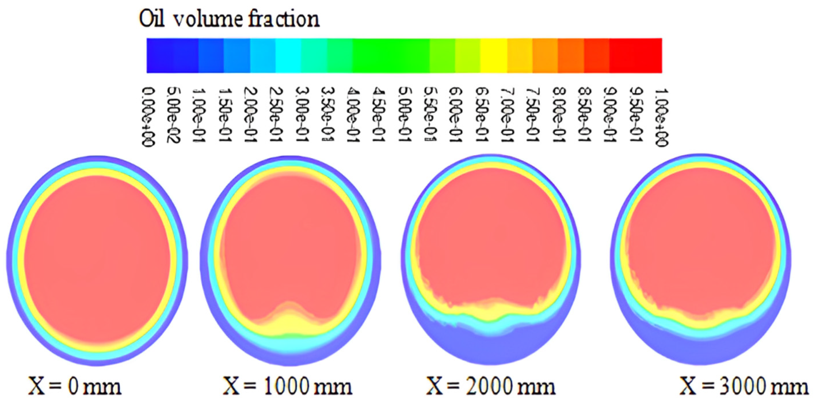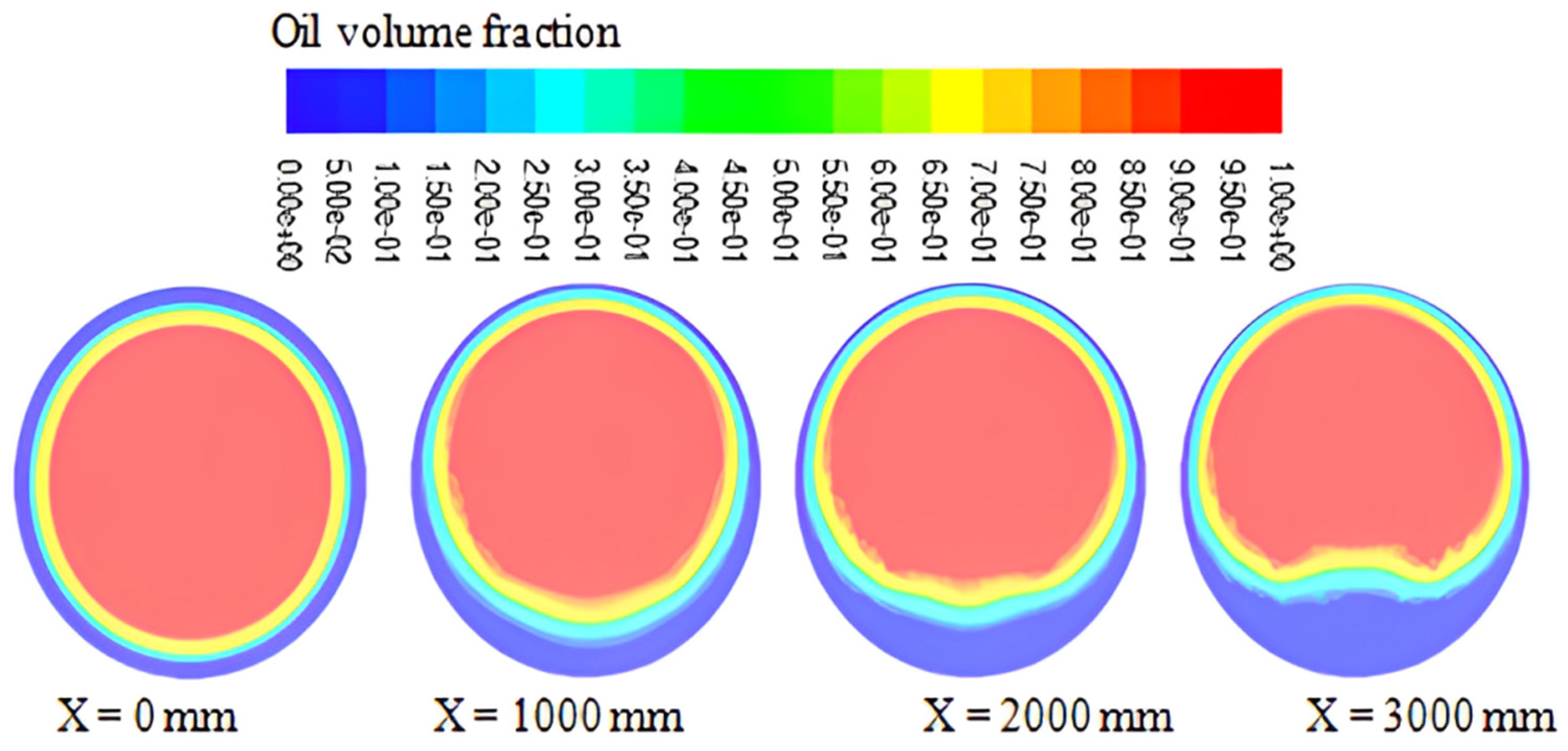 - The profiles of the temperature of the water, heavy oil, and air phases alongside the pipe revealed an expected lesser temperature near the pipe surface, which lowers the temperature of the liquids by the time they depart the pipe. Due to its proximity to the pipe wall, annular water experiences this temperature drop more dramatically.