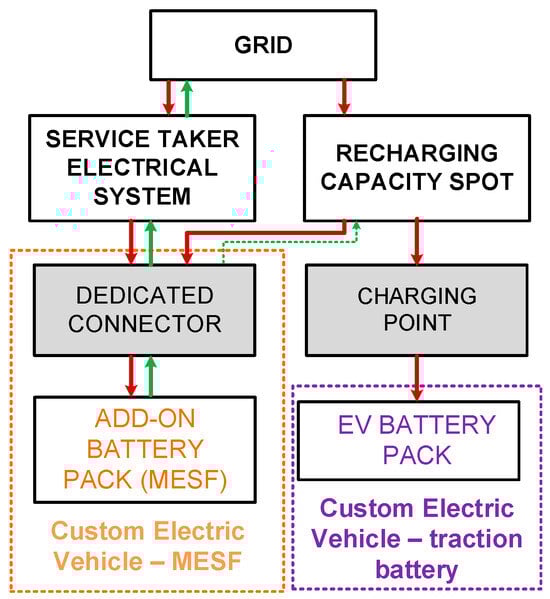 From Equation (3), it is evident that the electrical energy supplied by n CEVs must cover the demand for MESF services, and therefore it is necessary to first define the amount of this energy and adjust it to the transport capacity of CEVs. The CEV concept has been presented in previous studies [,]. It involves the setting up of an additional mobile electricity storage facility in the cargo area of commercial vehicles (both heavy and light). The main idea is that the energy from the MESF does not depend on the traction battery of the electric vehicle that transports it. It depends solely on the state of charge (SOC) of the battery, with the logistical task being the maintenance of the maximum charge level at the start of service. Figure 1 shows a block diagram of energy flows for a CEV vehicle.