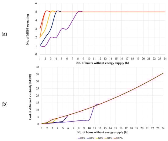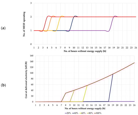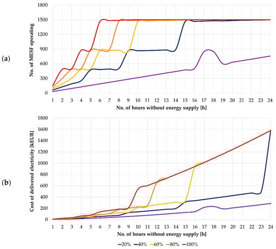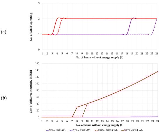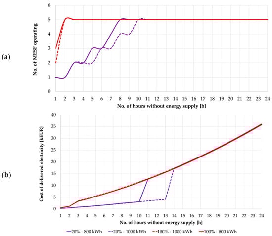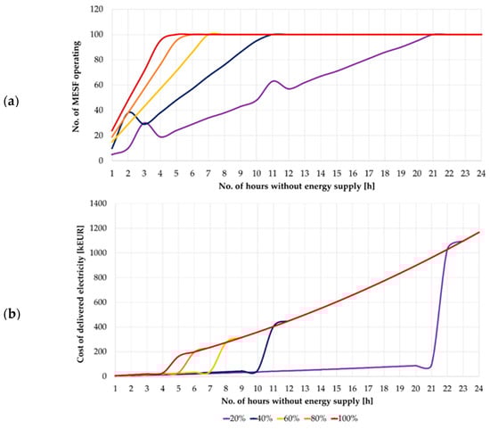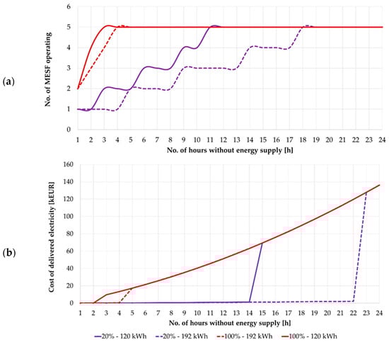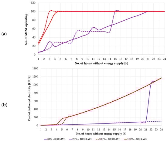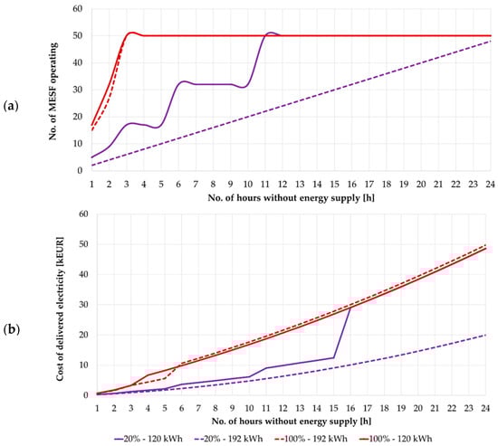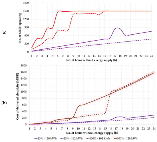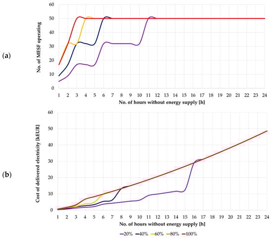 Based on Figure 10, it can be seen that the maximum number of CEVs set for ENT3 will cover 100% of its energy needs for approximately 3 h. It is worth noting that the function curve for 80% and 100% coverage is the same. If consumption is prioritized and the level of secured energy demand is reduced to 20%, the power supply can be maintained for approximately 15 h. It should also be emphasized that the recorded MESF battery capacities were not less than 60 kWh for cases with a high share of consumption prioritization and gradually approached 120 kWh. Simulations were then performed for option B. Figure 11 shows a comparison of options A and B for two extreme cases of the ENT3 entity’s security level, i.e., 20% and 100%.